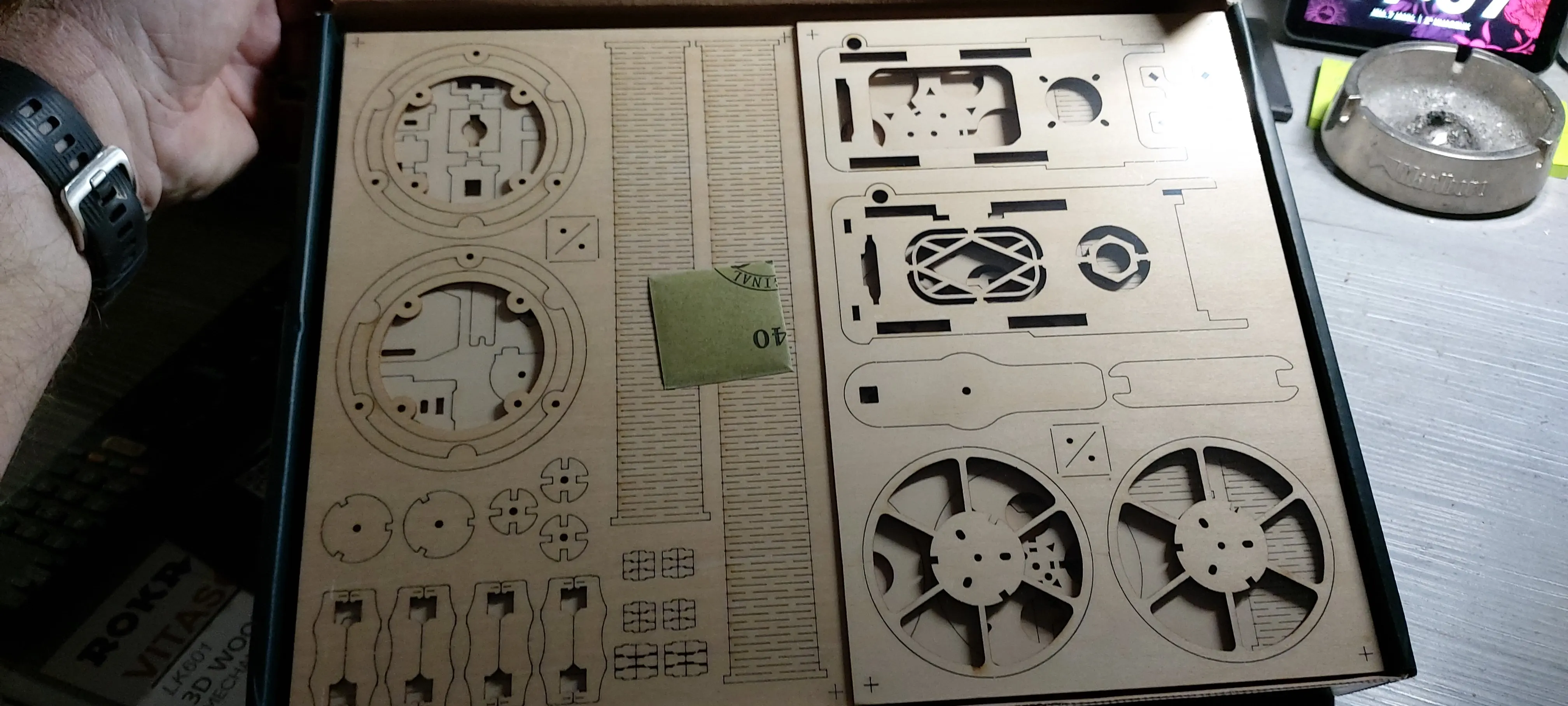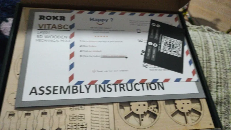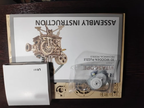 Отправили очень быстро, за две недели . Коробка была помята. Все в комплекте цело:инструкция, детали деревянные +фильм Чаплина. Дополню отзыв после собирания.
