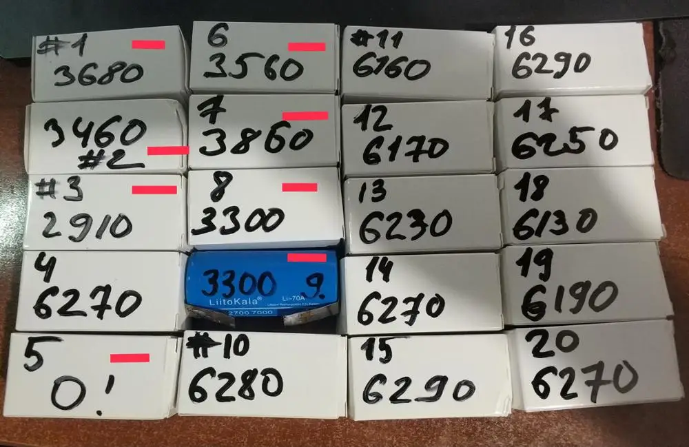 Доставка 35 днів. Напруга на акумах була майже на всіх 3.21в, лише на одному була 3.14в. Внутрішній опір 6,5 - 7,5 міліОм