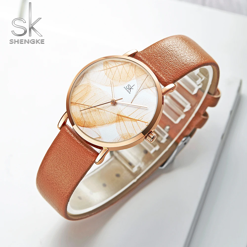 Часы Shengke женские кварцевые, креативные модные повседневные наручные, с ярким кожаным ремешком, с листьями
