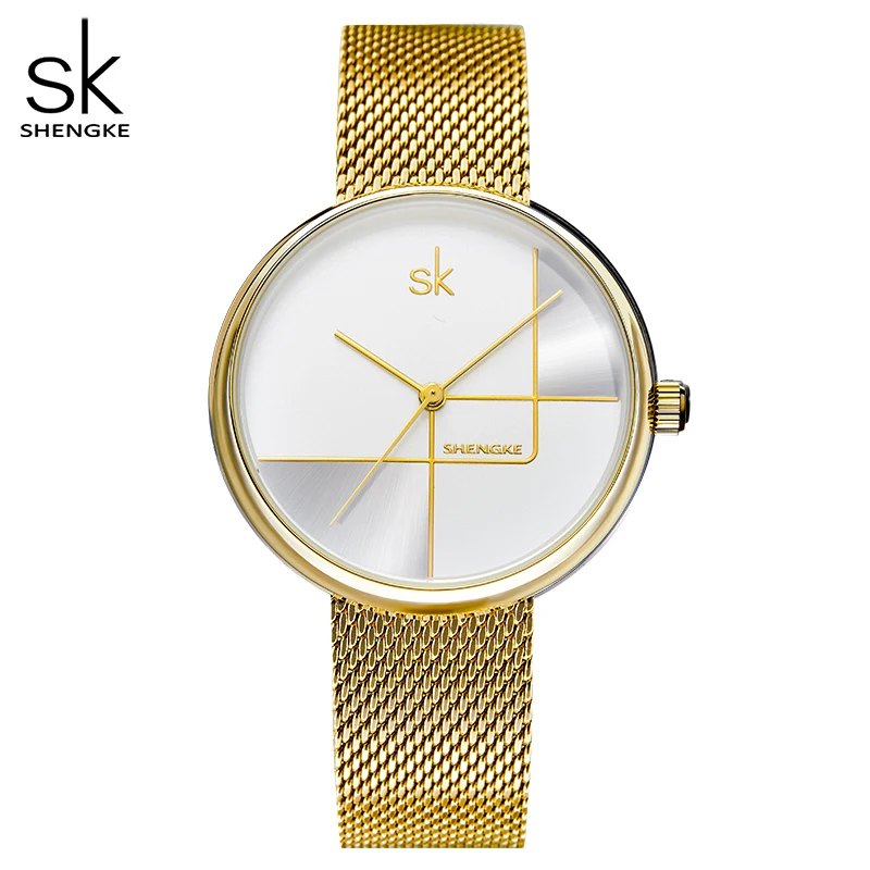 Часы Shengke женские, золотистые, с сетчатым стальным браслетом