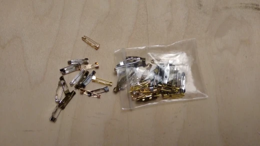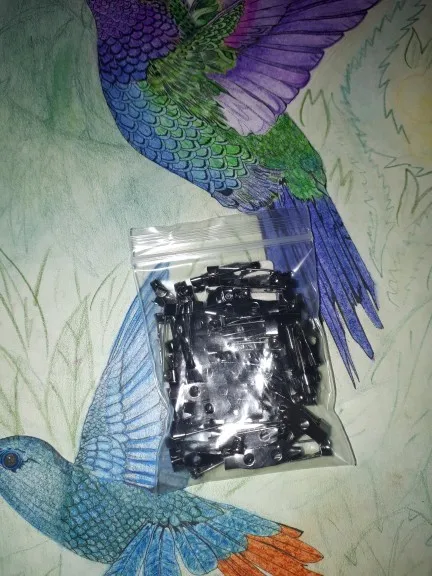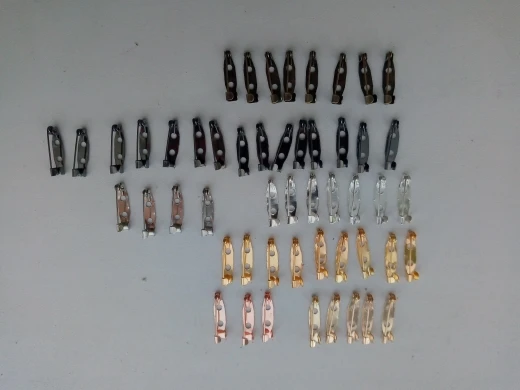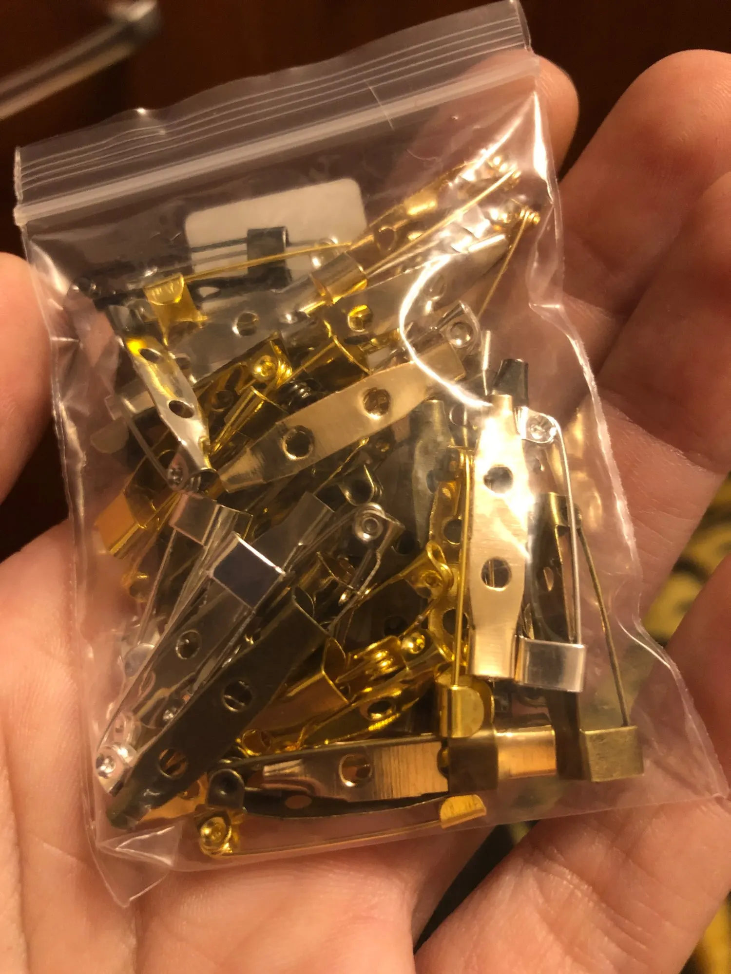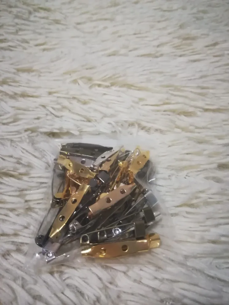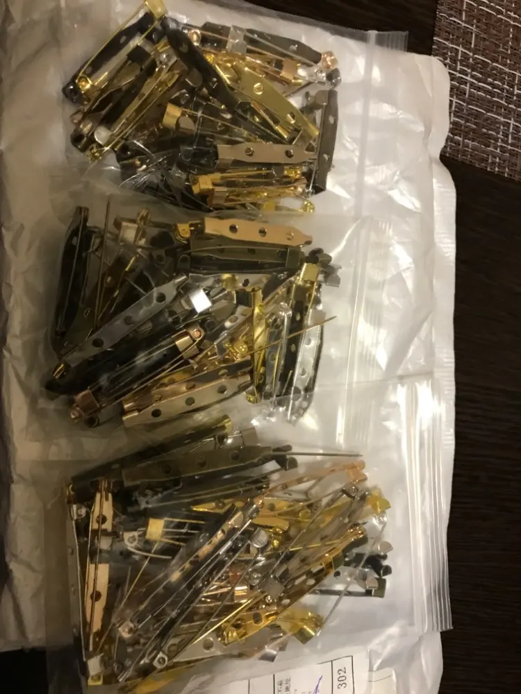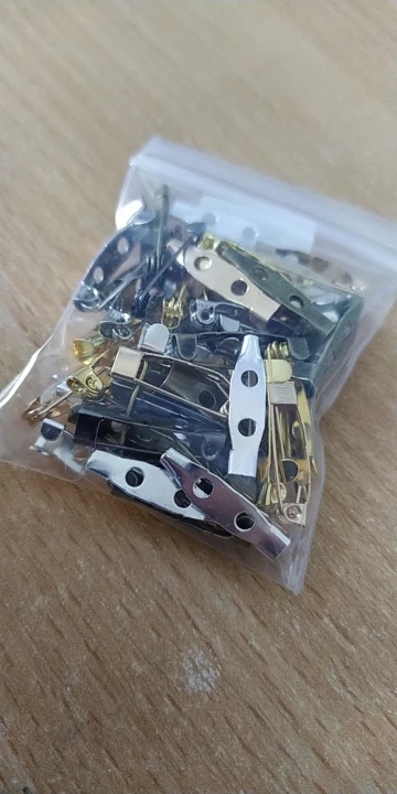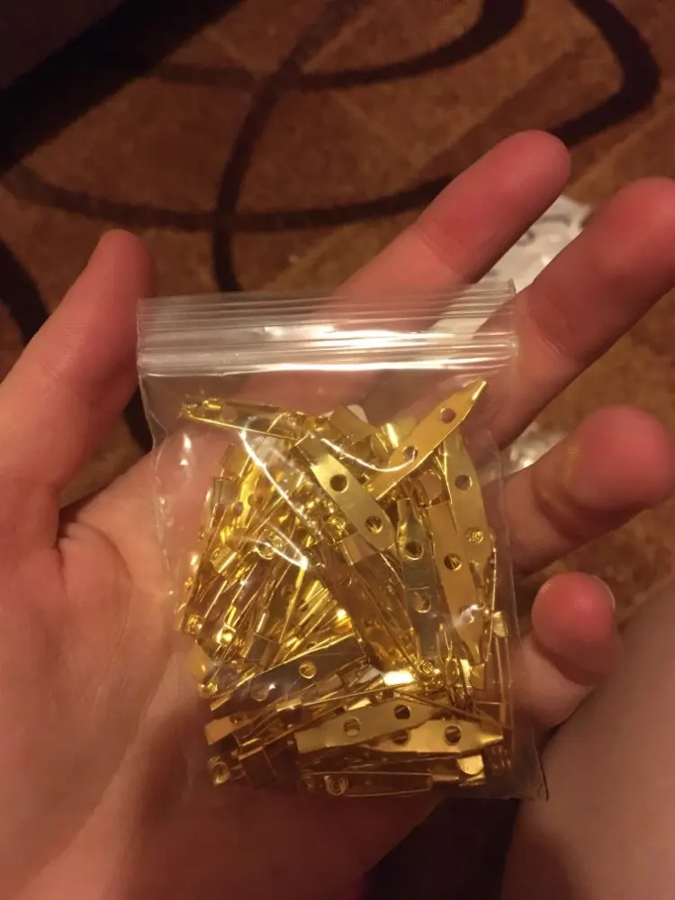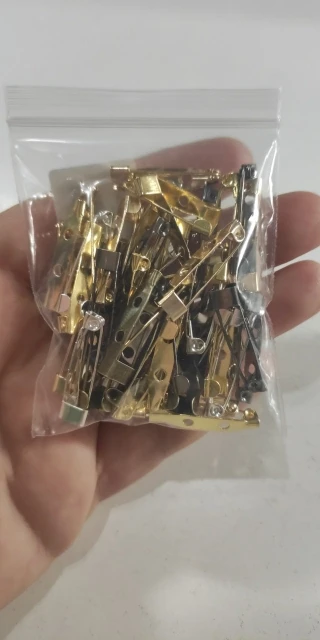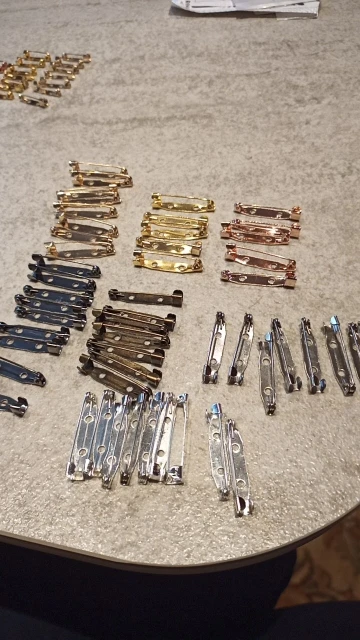 Пришло меньше 50 штук (26 "золотых",17 "серебряных" и 11 "бронзовых"). Написано в описании, что цинковый сплав, но они все прилипают к магниту. Застёжки, возможно, не очень надёжные, так как короткие застёжки для иголочек, но в целом застёжки достаточно упругие. В целом нормальные штучки, можно к ним приклеивать или пришивать через отверстия что-либо.