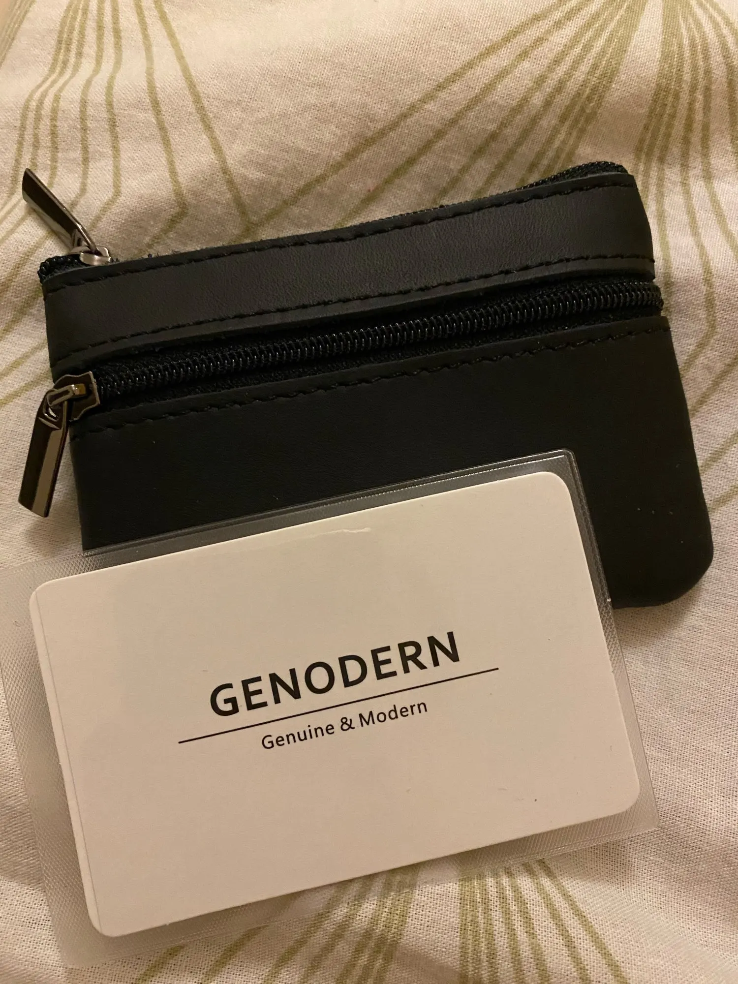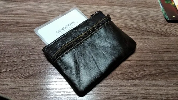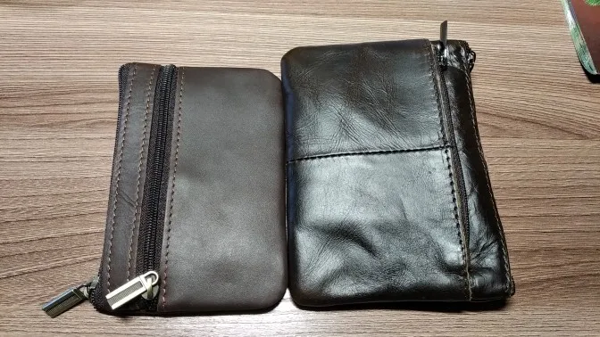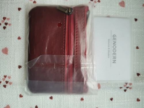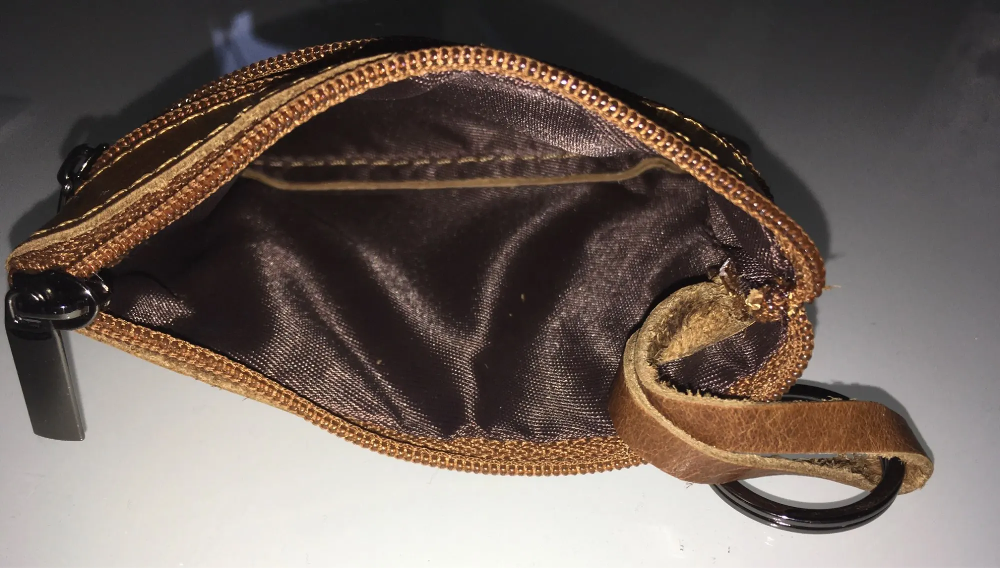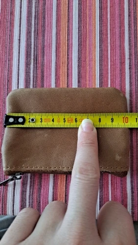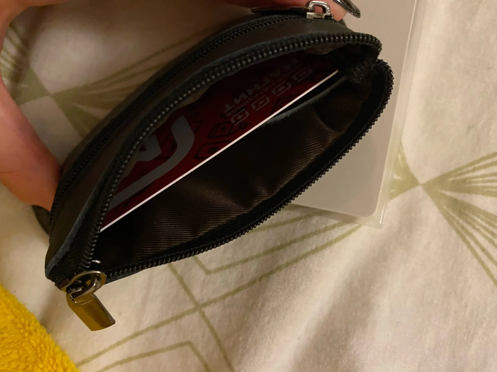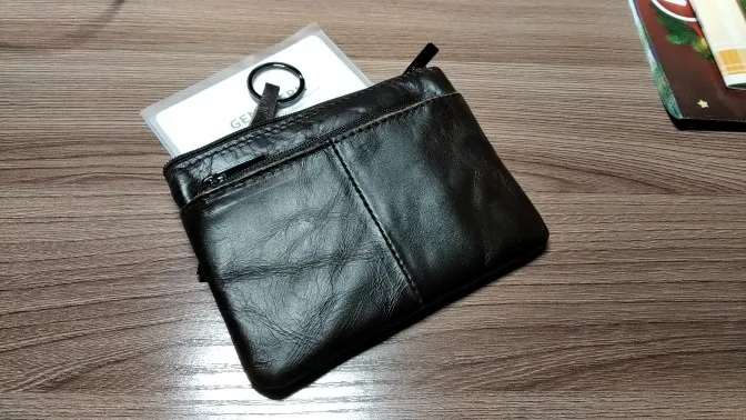 Precioso y cuero auténtico. Tres cremalleras muy útiles, y caben las tarjetas perfectamente