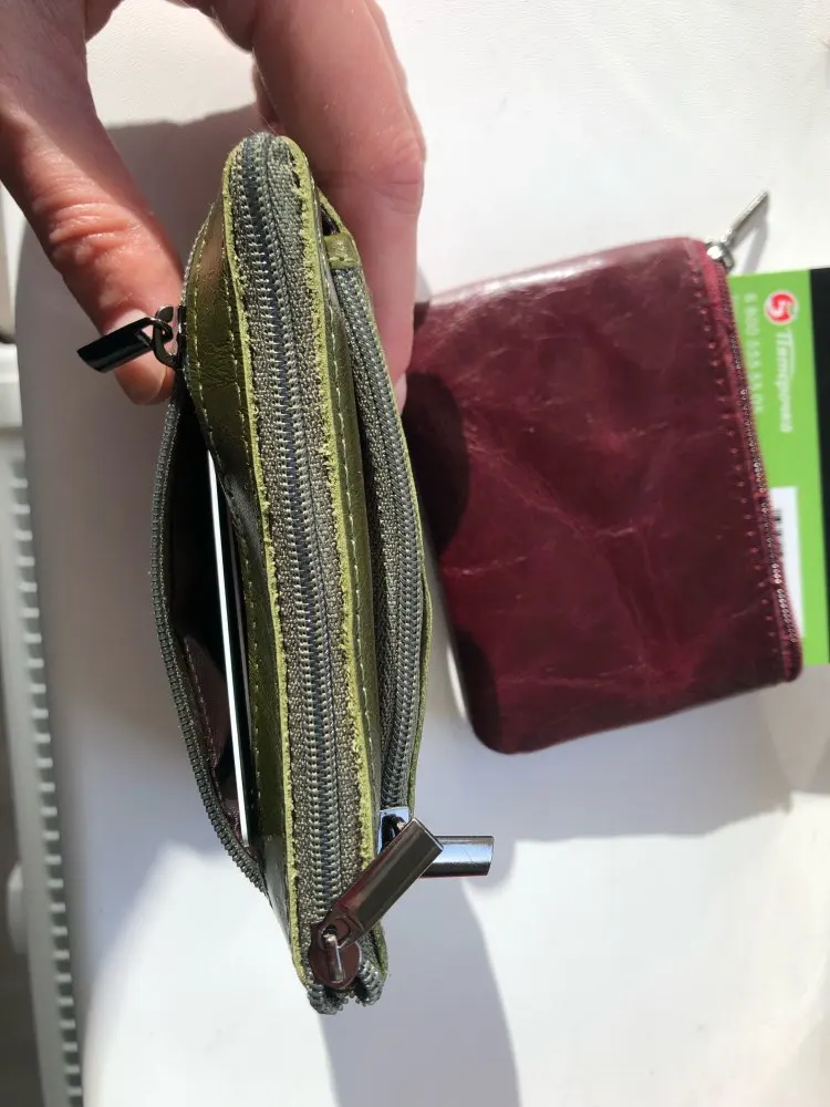 Зелёный побольше размера, чем бардовый. И у зелёного 3 отделения. У бардо только 2. Кожа у обоих приятная , внутри сделаны аккуратно. Мне больше подошёл зелёный, тк удобно деньки, карточки и мелочь в разных отделениях хранить