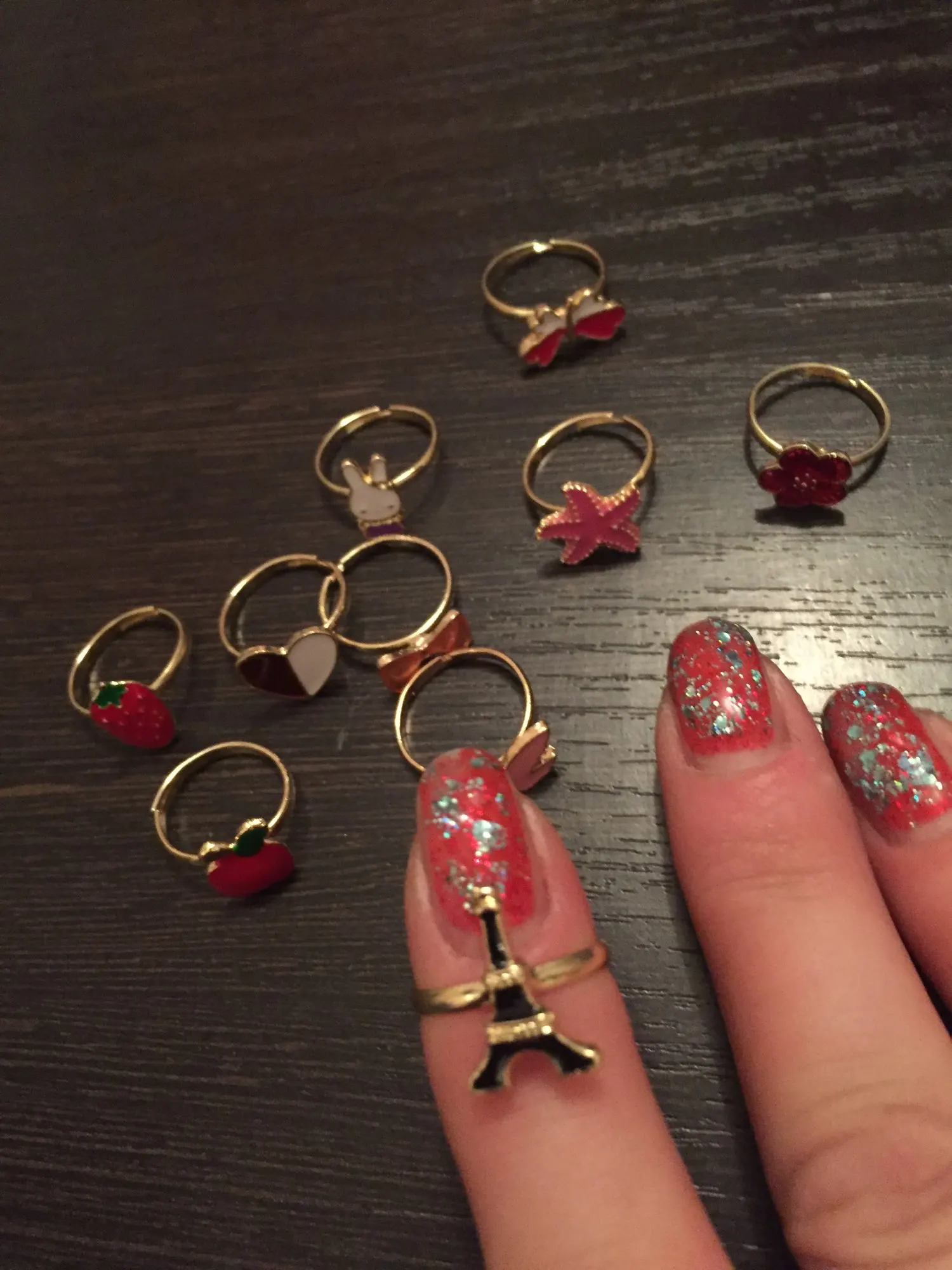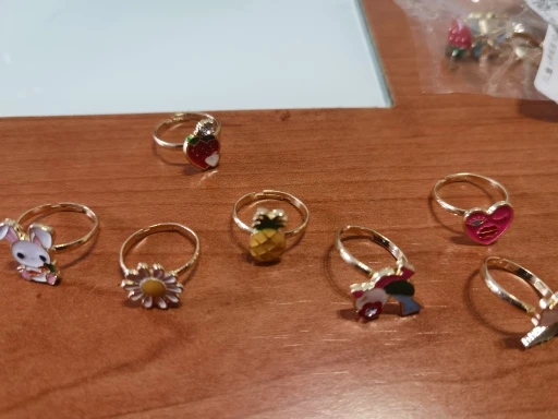 Отличные колечки, аккуратные, размер регулируется. Дошло меньше чем за месяц. Продавцу спасибо. Заказывала два набора по качеству больше понравились с разными изображениями (бантики, вишенки, кошечка и т.д.)