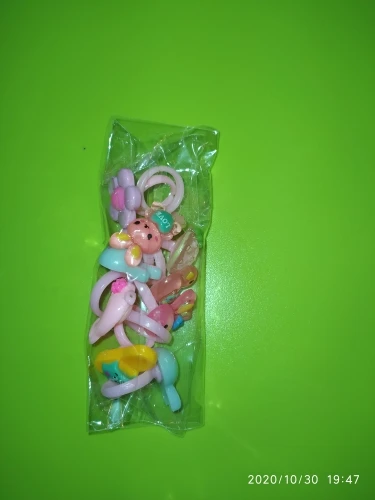 милые, симпатичные колечки!) заказываю не первый раз и в этот раз пришли другие по тематике, нежели в прошлый раз. Повторка только одна, но это тоже неплохо - дочка будет в садике обмениваться с девчонками "брюликами" буду заказывать ещё)