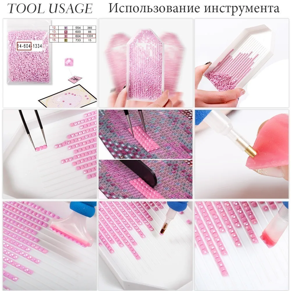 Инструменты включают в себя: алмазную пластину, клей, пинцет, ручки (наклеить 10 бриллиантов одновременно)