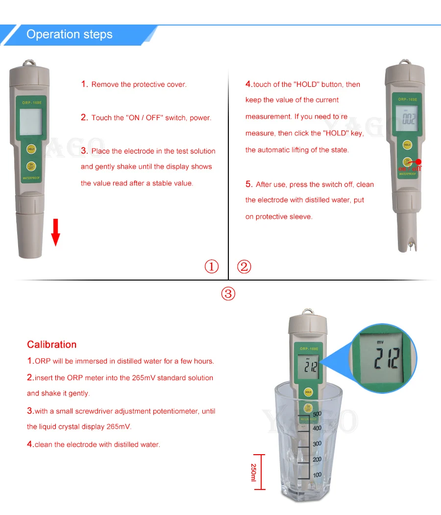 1. Снимите защитную крышку. 2. Коснитесь переключателя «Вкл/Выкл», питания. 3. Поместите электрод в тестовый раствор и аккуратно встряхните до тех пор, пока значение дисплея не станет стабильным. 4. Нажмите кнопку «HOLD», затем сохраните значение текущего измерения. Если вам нужно повторно отмерить, то нажмите кнопку "HOLD" автоматически отпускается при удержании. 5. После использования нажмите на выключатель, электрод с дистиллированной водой, наденьте защитный рукав.