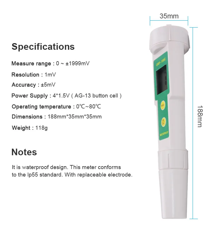Особенности: 1. Это многофункциональный испытательный аппарат ОВП, предназначенный для проверки потенциала окисления-редукции. 2. Используйте эргономику. Пользователю легко и быстро пользоваться с простым режимом работы клавиш и комфортным ощущением руки. 3. Большой экран отображает результаты теста на pH для легкого и точного считывания. 4. Точное измерение, быстрый ответ, хранение данных. 5. Изготовлен из высококачественного пластика, прочный и прочный, водонепроницаемый. 6. Применимые отрасли: бассейн, лаборатория водоснабжения, аквакультура, больница