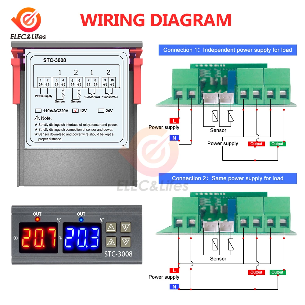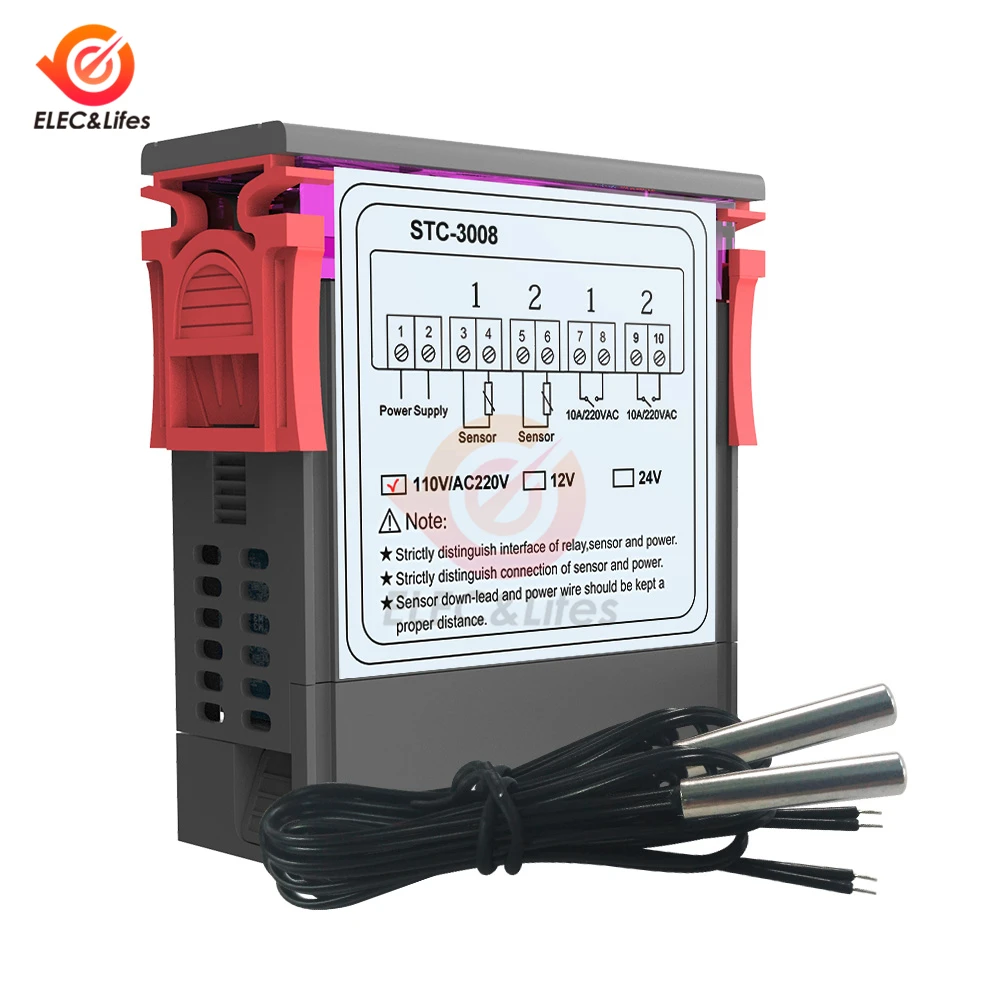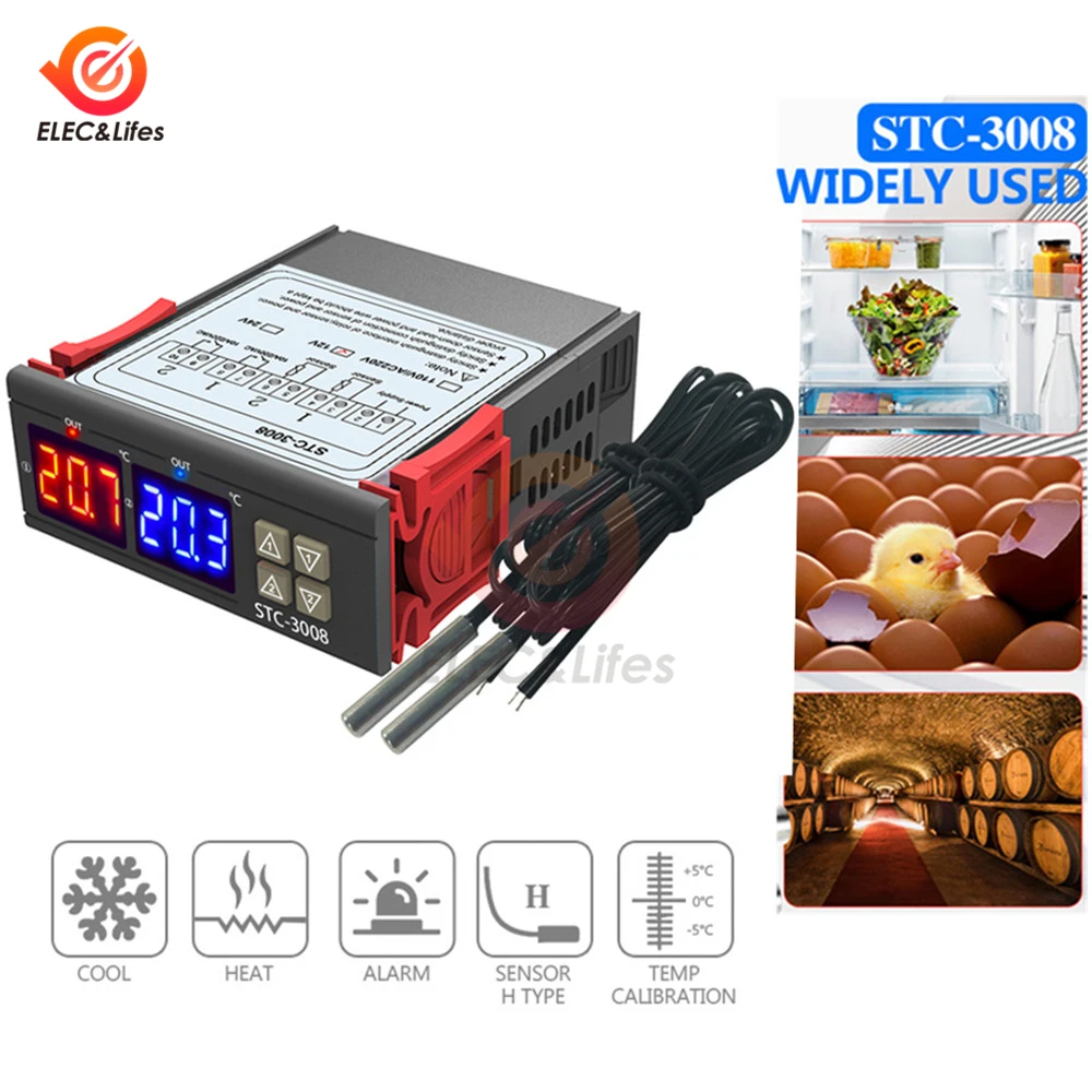 STC-3008 двойной цифровой регулятор температуры с двумя релейными выходами 12 В, 24 В, 220 В, терморегулятор, термостат с нагревателем, охладителем STC3008