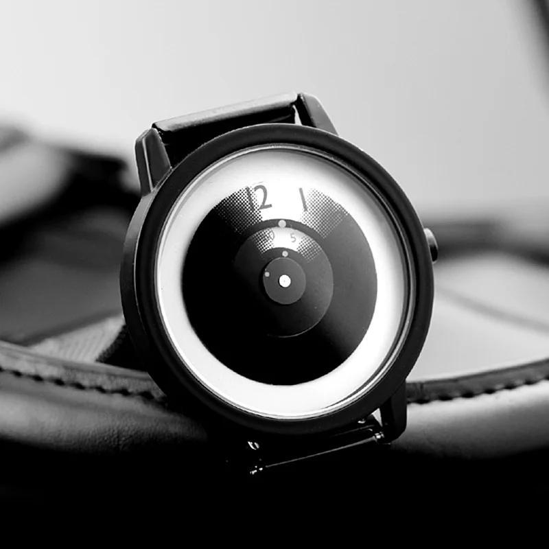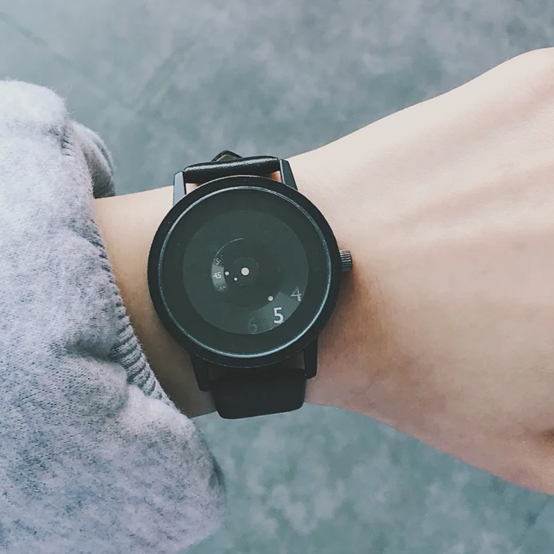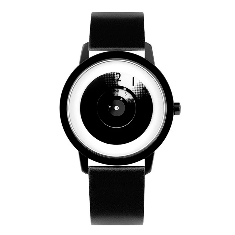 Без указки поворотные креативные часы модные повседневные мужские и женские кожаные кварцевые часы Уникальный дизайн циферблата черные наручные часы унисекс