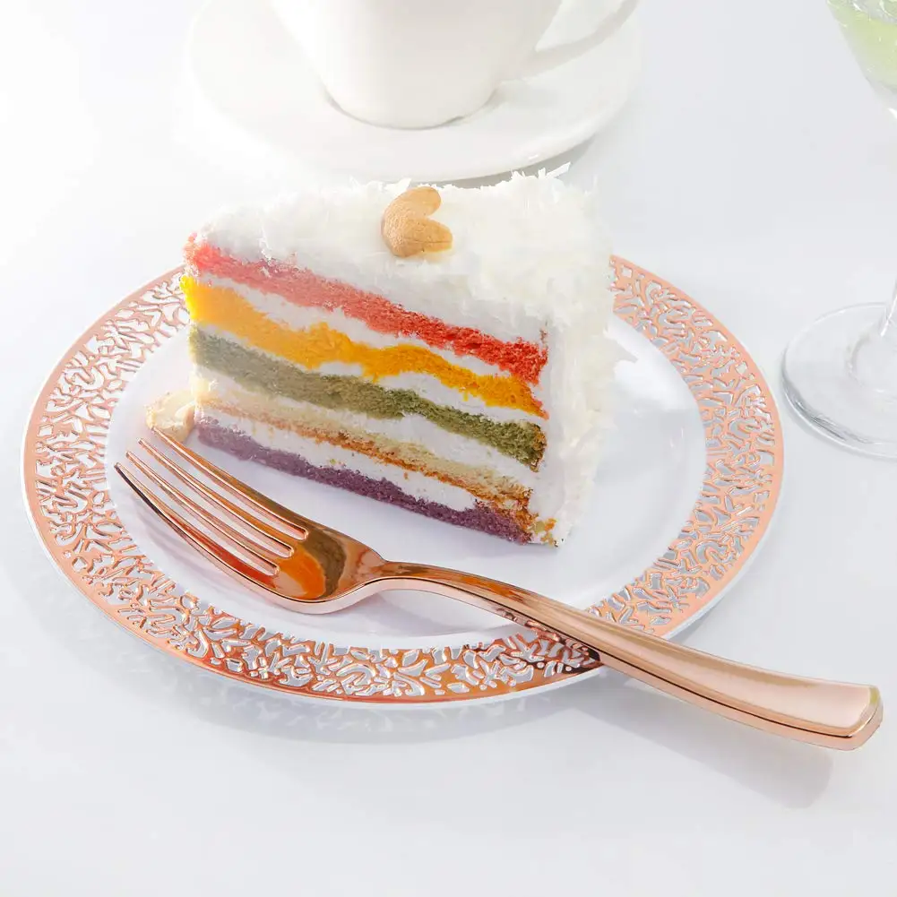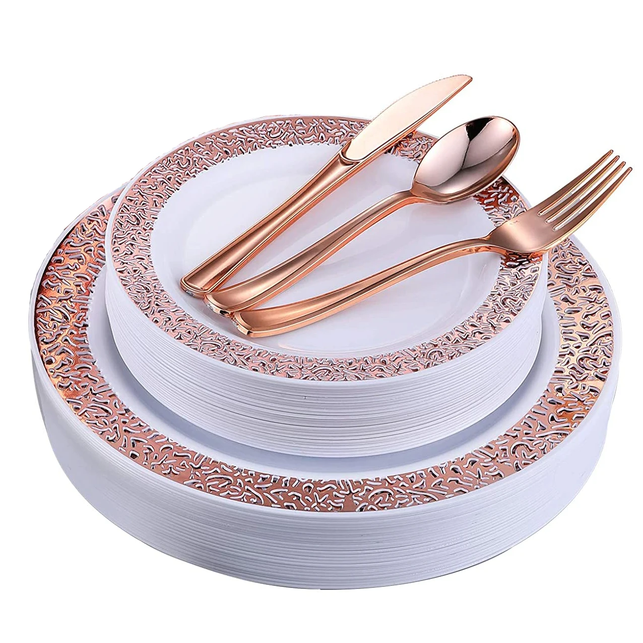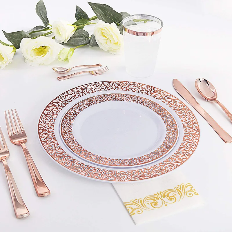 Пластиковые тарелки из розового золота для 25 гостей с одноразовой пластиковой посудой, кружевные дизайнерские пластиковые наборы посуды для праздников