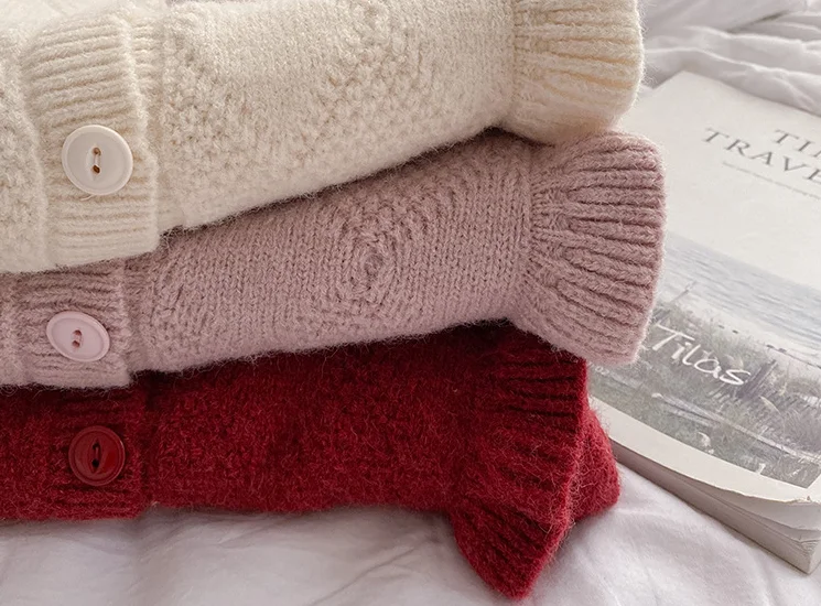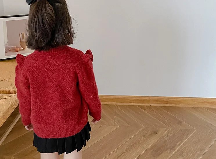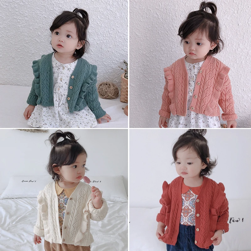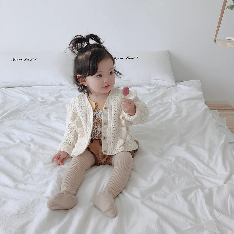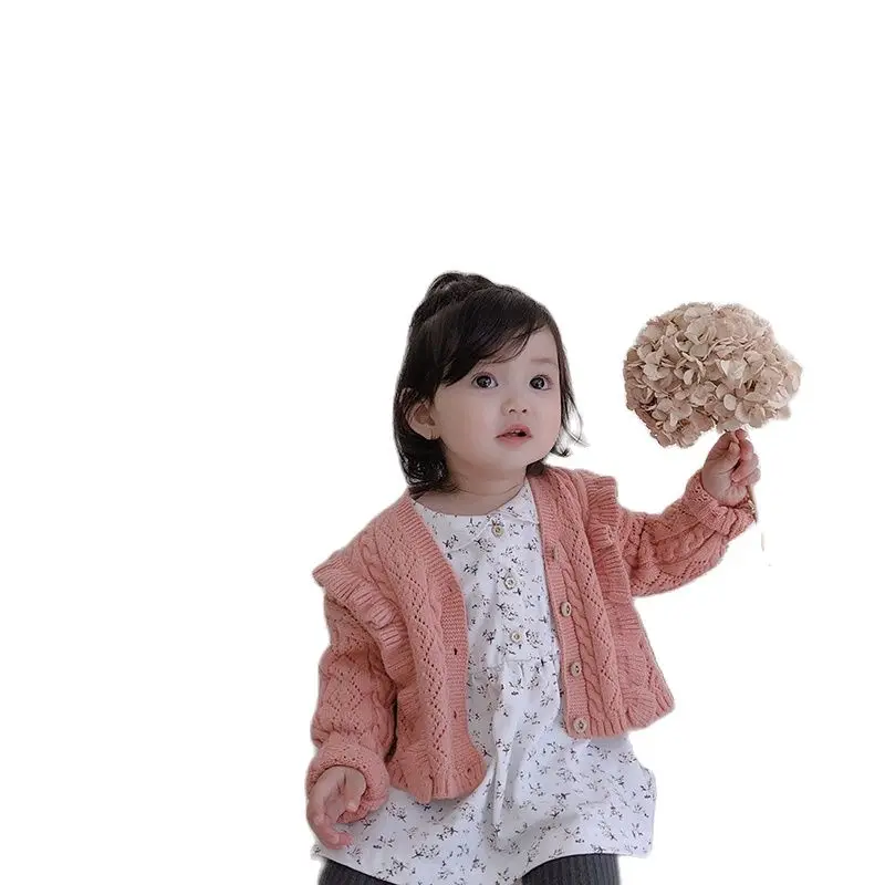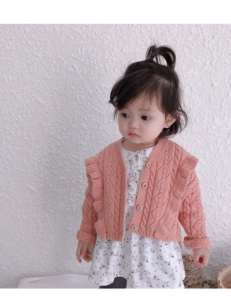 Демисезонный милый однобортный кружевной свитер с V-образным вырезом для девочек, детский хлопковый Кардиган с длинным рукавом, трикотажное пальто для маленьких детей