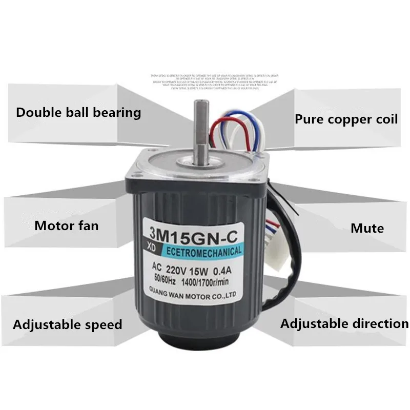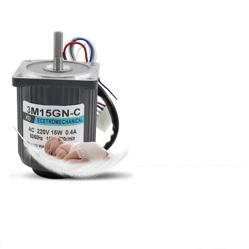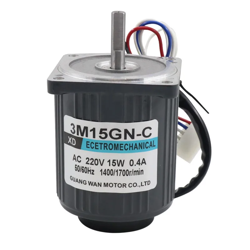 Характеристики:3M15GN-CНапряжение: ac220вМощность: 15 ВтРазмер двигателя: 70 мм * 90 ммДиаметр выходного вала: 8 ммСкорость: 1400 об/минОбласть применения: станок для резки. Машина для наполнения мешков, газонокосилка. Электрическая дрель, намоточная машина, машина для производства хлопковых конфет