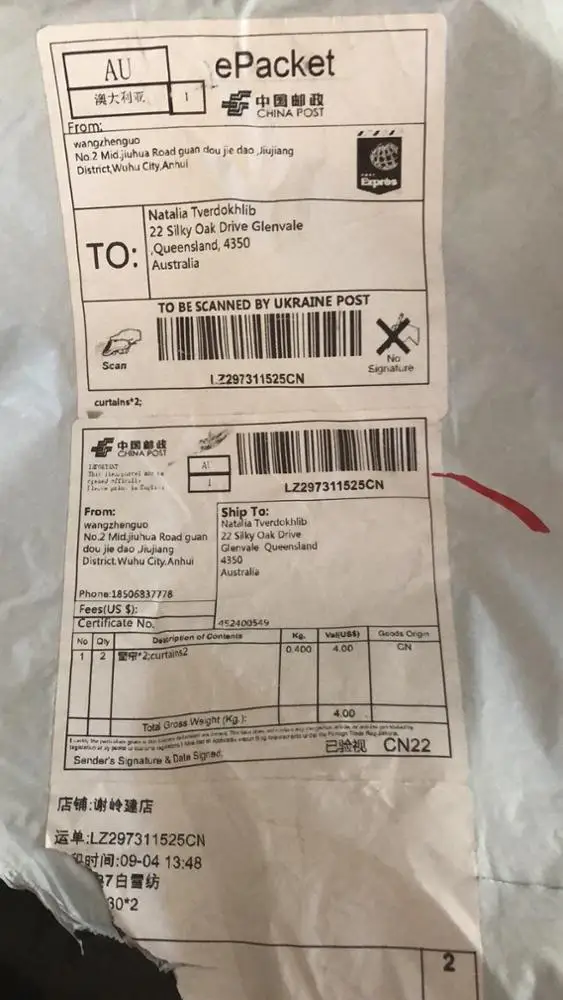 Страна: CH Color: White Size: W400xL250cm 1pc Processing: 4.Back Tape Доставка: China Post Registered Air Mail 07.11.2020