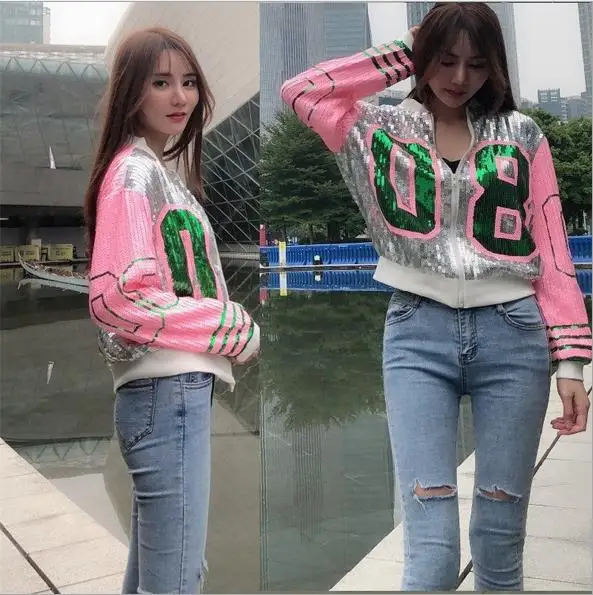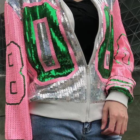 Греческая мода женская уличная одежда пальто 08 блестки на молнии с длинным рукавом спортивный рукав летучая мышь розовые и зеленые соворотные куртки