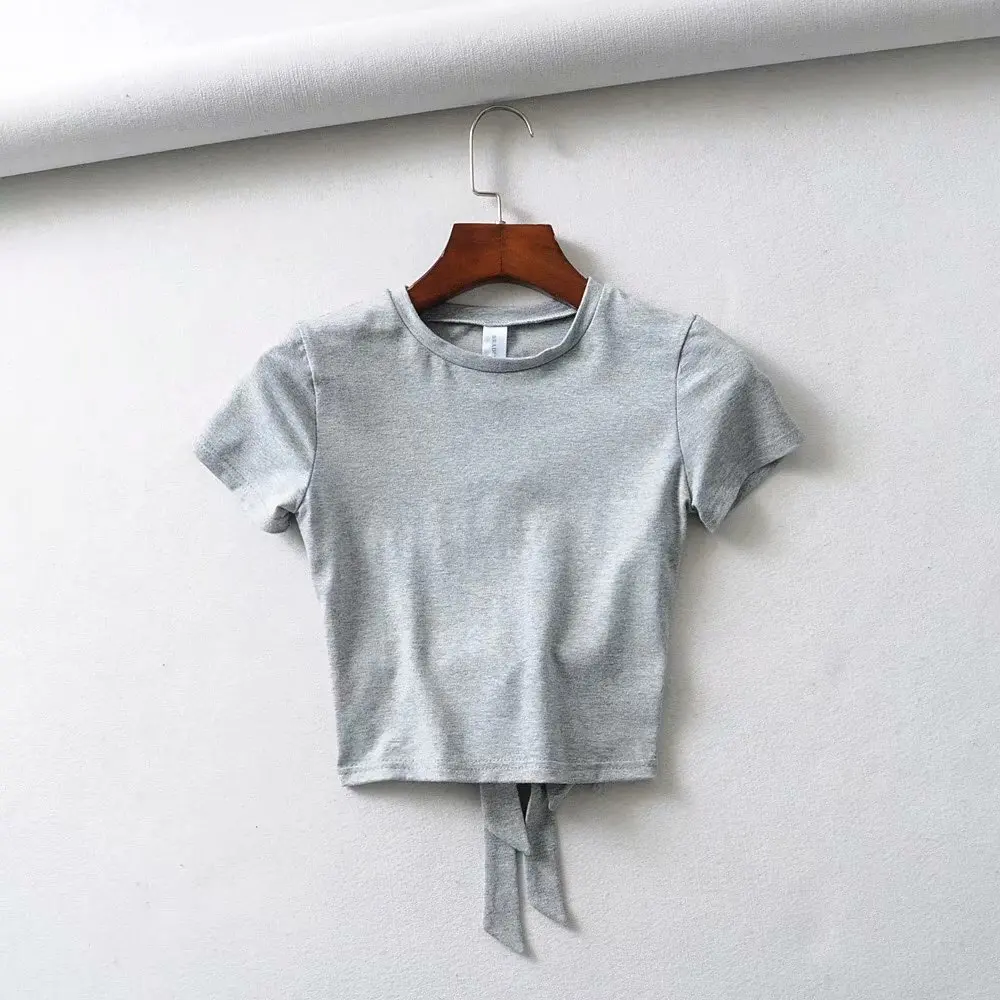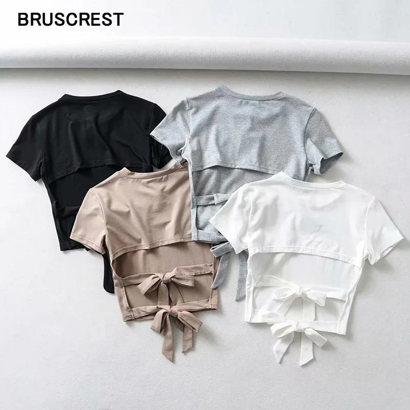 Женский винтажный топ с бантом, черная или белая футболка с открытой спиной и коротким рукавом, уличная одежда, летний топ