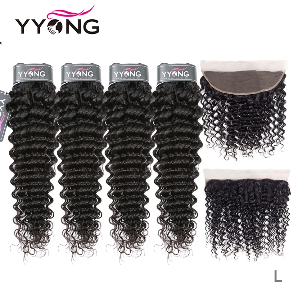 Yyong волосы 34 Бразильские глубокие волнистые пряди с фронтальной 100% Remy натуральные кудрявые пучки волос пряди с 13x4 кружевной фронтальной можно окрашивать