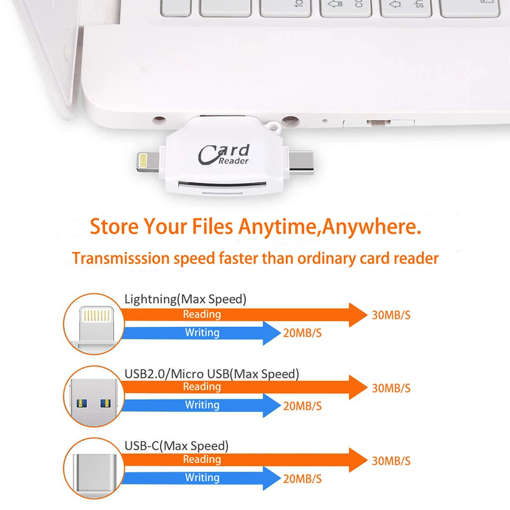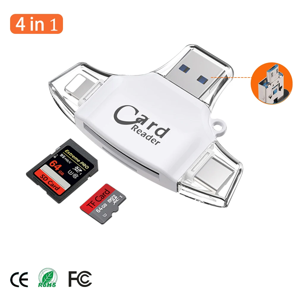 Кардридер 4 в 1, маленький портативный дизайн для разъема iOS/Micro SD USB/USB C (на телефоне Android должна быть открыта Функция OTG);