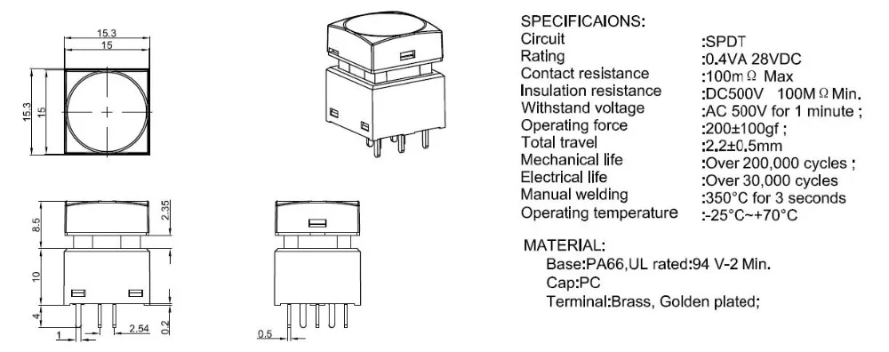 PB26-13M Square 15*15 мм светодиодный подсветкой SPDT, мгновенный самовозвратный фотопереключатель для видеопроцессора