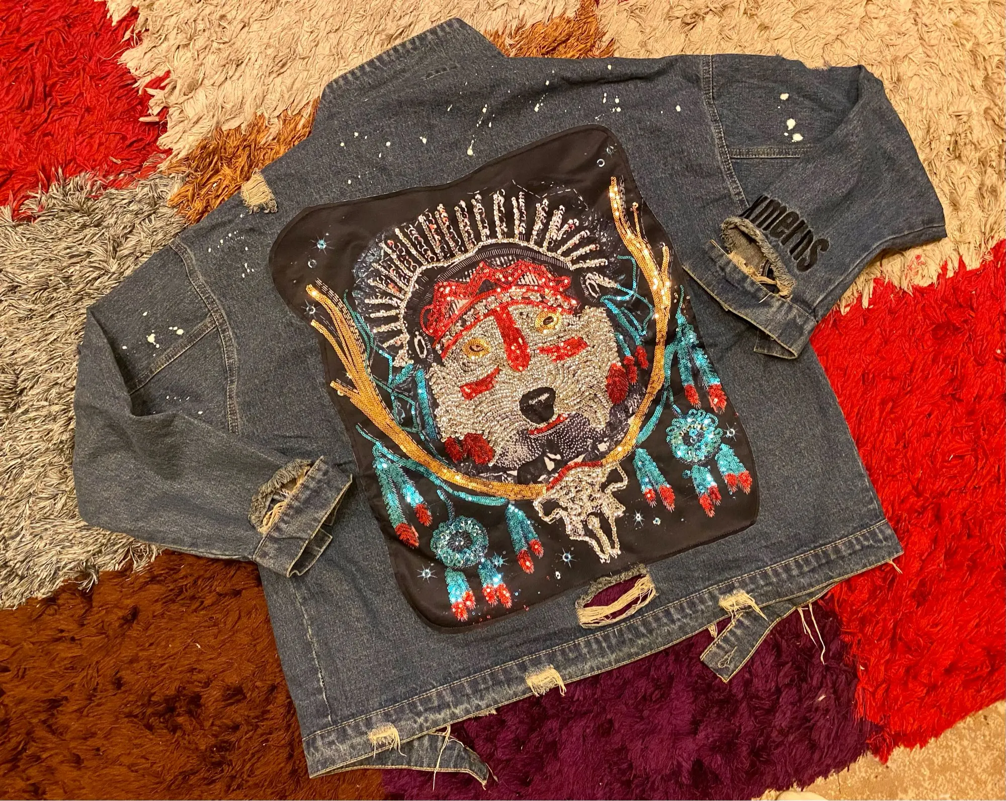 Женская джинсовая куртка с блестками, Свободная Повседневная Длинная куртка в стиле Харадзюку С тотемным принтом волка, легкая весенняя одежда