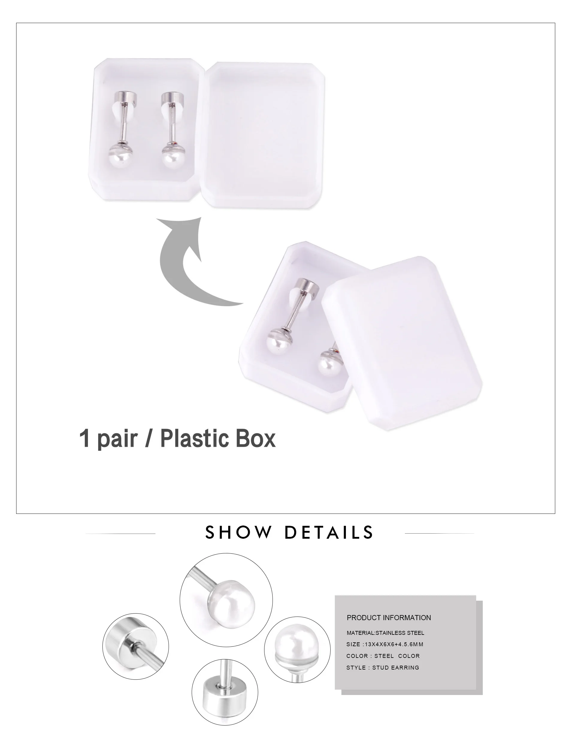 Серьги-гвоздики из нержавеющей стали, 456 мм, с имитацией жемчуга