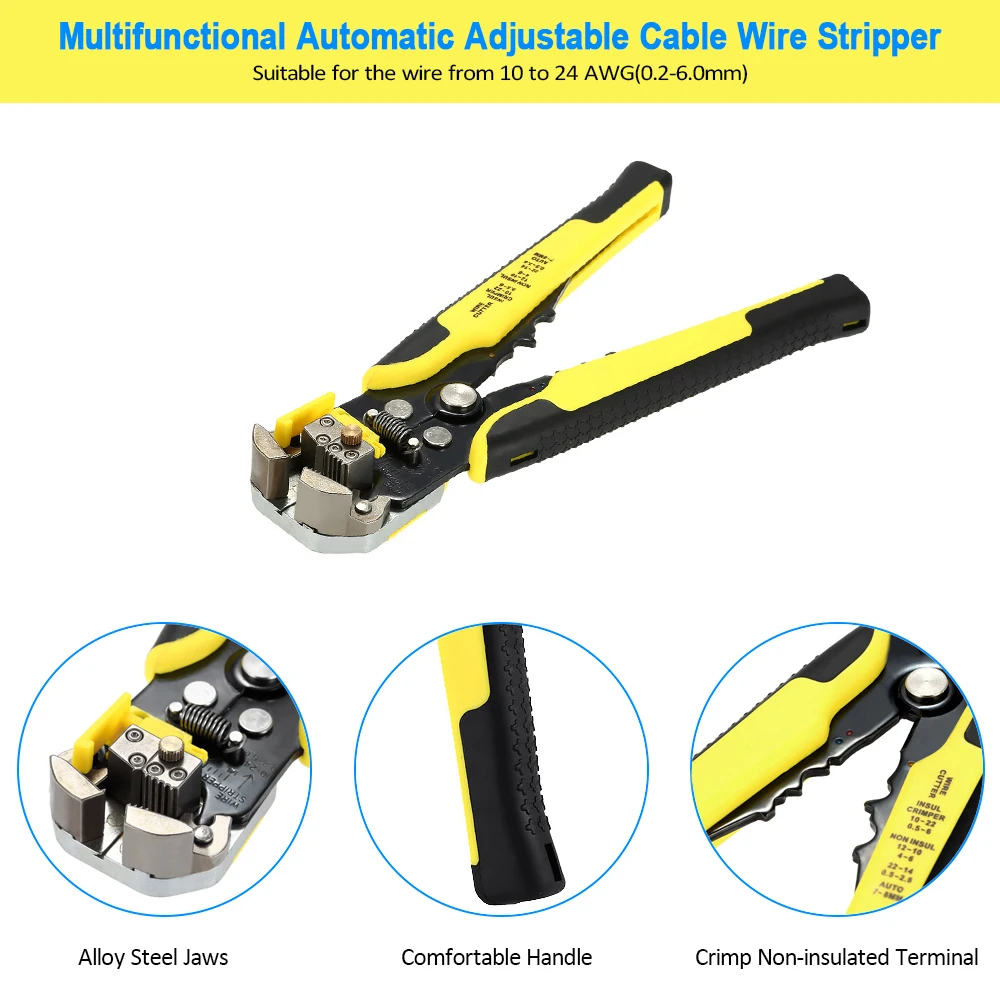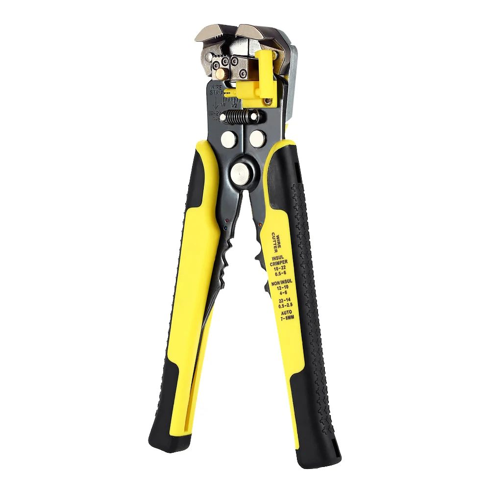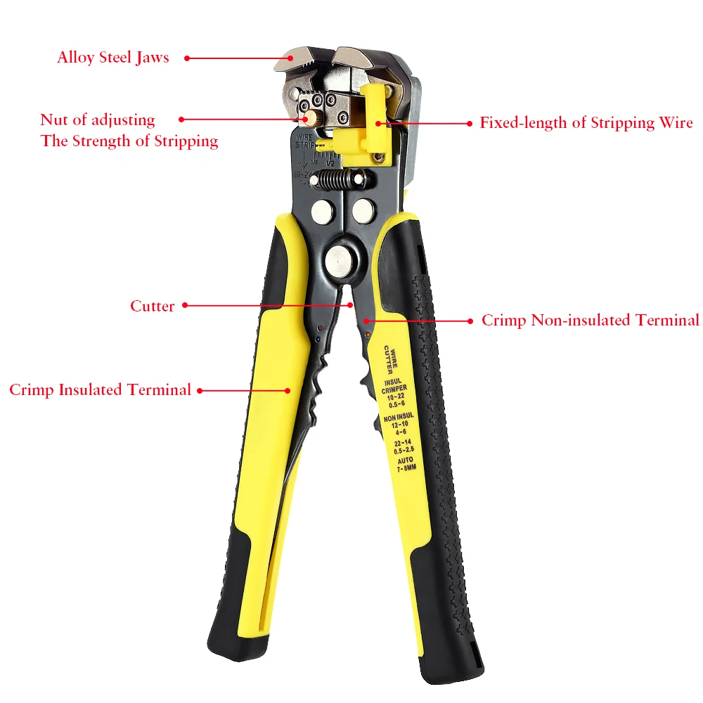 Эти профессиональные и практичные обжимные инструменты с саморегулируемыми обжимными плоскогубцами обеспечивают удобство, эффективность и безвредность сердечников кабеля. Он прост в использовании, просто удерживайте ручку и управляйте ею один раз, чтобы успешно нажать плотно прилегающие провода и клеммные блоки. Особенности:Благодаря большому захвату ручки, легкая и компактная конструкция и конструкция ручки обеспечивают идеальный эффект обжима.Профессиональный инструмент для обжима проволоки с саморегулируемым механизмом храповика и зачистки проводов, для удобства эксплуатации.Подходит для большинства неизолированных обжимных терминалов и разъемов.С 4 взаимозаменяемыми клеммами с различными диапазонами обжима.Мульти-функциональный провод для зачистки для разъемов от 24 до 10AWG (0,2-6.0mm ²).Разработан в соответствии с инженерными факторами человека, он может экономить 50% энергии при обжиме. Характеристики:Название бренда: MeterkМодель: JX-D4301Материал: Высокоуглеродистая сталь + сплавЦвет: желтый + черныйПодходящие клеммы и Диапазон обжима проводов:1. Цветовые кодовые гнезда + изолированные клеммы 24-14 AWG (0,25-2.5mm ²), холоскоп: 0,25, 1,5, 2,5;2. Конец шнура терминалы 24-10 AWG (0,25-6.0mm ²);3. Неизолированный открытый Цилиндрический разъем 26-16 AWG (0,14-1,5 мм ²);4. MC4 солнечной разъем клеммы 14-10 AWG (2,5-6.0mm ²).Диапазон зачистки проводов стриптизерша: 24-10 AWG (0,2-6.0mm ²)Размер проволоки: прибл. 19*8*2,0 см/7,48*3,15 * 0.79inВес щипцы для проволоки: прибл. 348,5 г/12,29 унцийРазмер зачистки проводов: прибл. 21*10,5*2,8 см/8,27*4,13*1,10 дюймовВес зачистки проводов: прибл. 316 г/11,15 унцийРазмер посылка: прибл. 28*14,5*6 см/11,02*5,71 * 2.36inВес посылка: прибл. 1033 г/36,44 унций Посылка:1 * щипцы для проволоки1 * S2 отвертка1 * сумка для хранения3 * Запасные штампы4 * винты