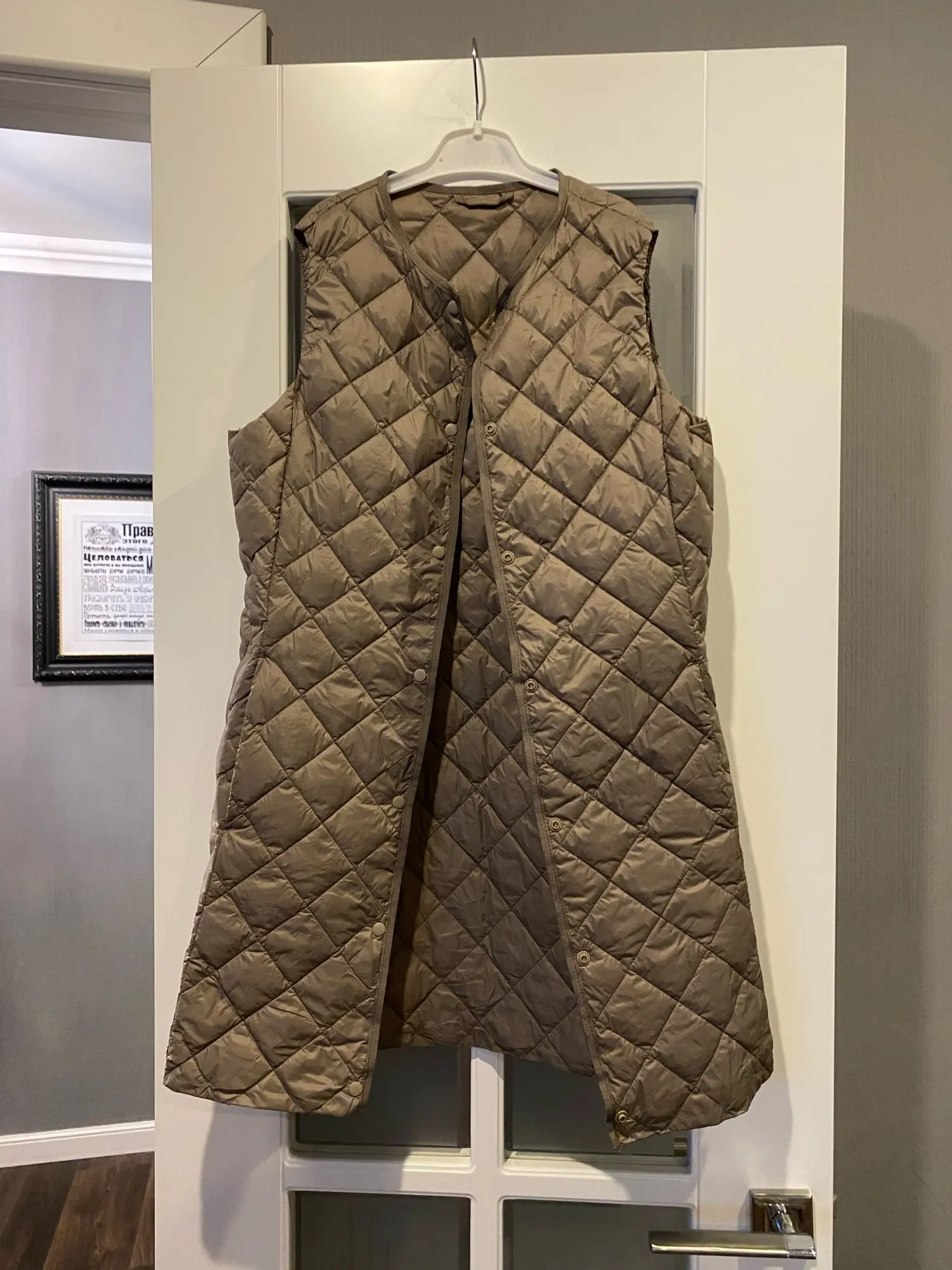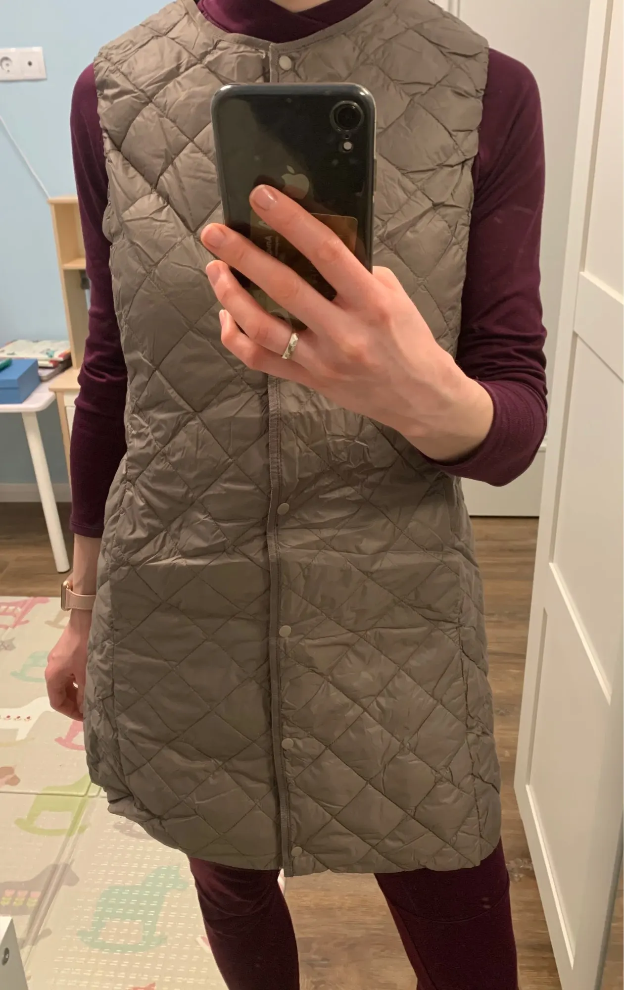 На фотографиях продавца выглядит более презентабельно и цвет и качество. Фактически это тончайший жилет. Начиталась отзывы и на свой 40-42 взяла М и да на толстовку будет самое то, но на водолазку уже слишком большая в пройме. Заказ оформляла в постомат и получила примерно за 1,5 недели.
