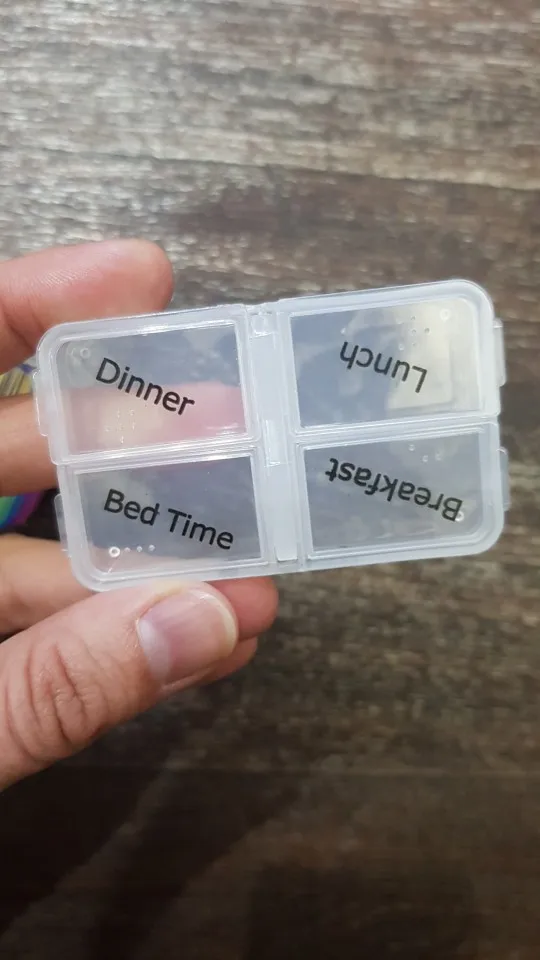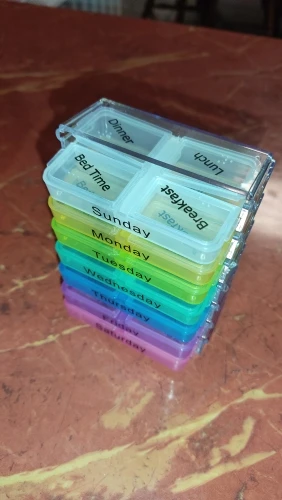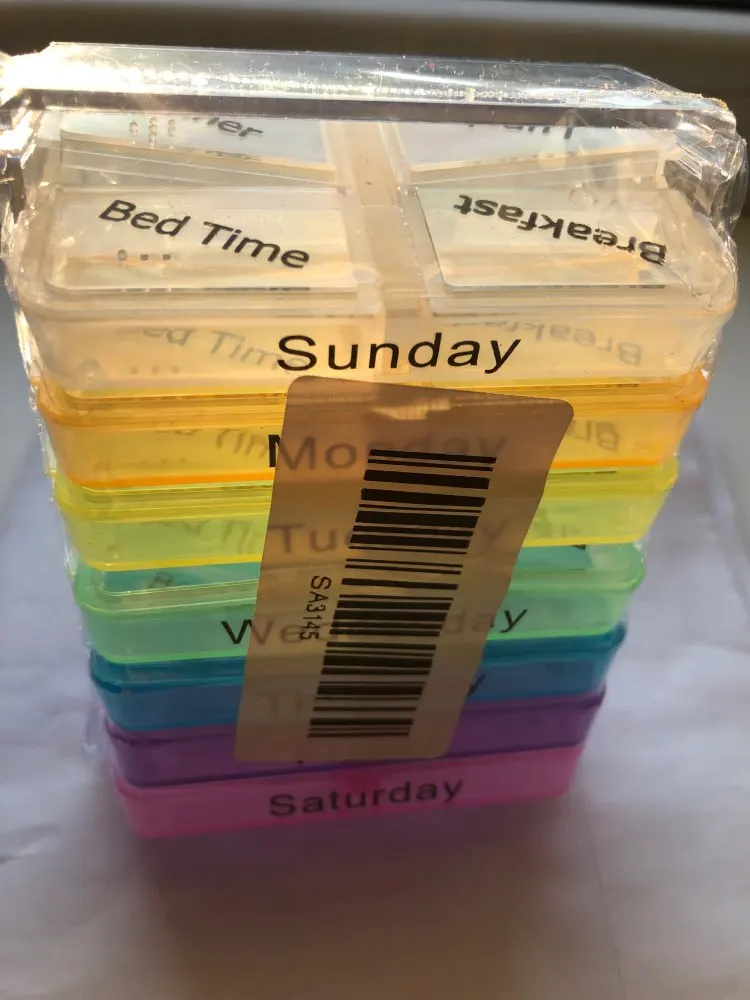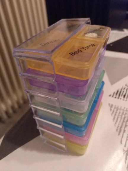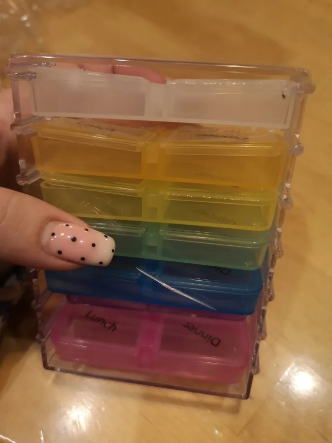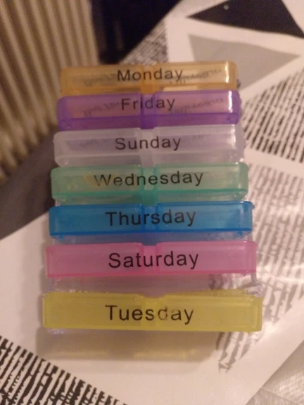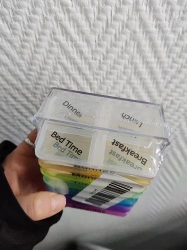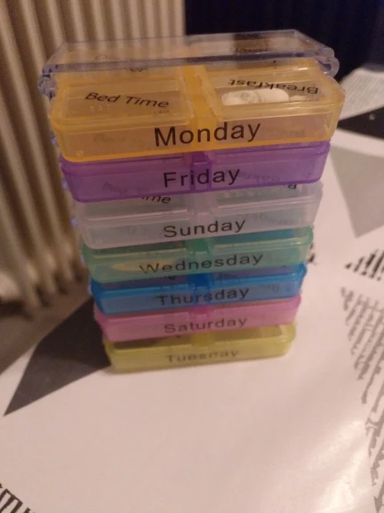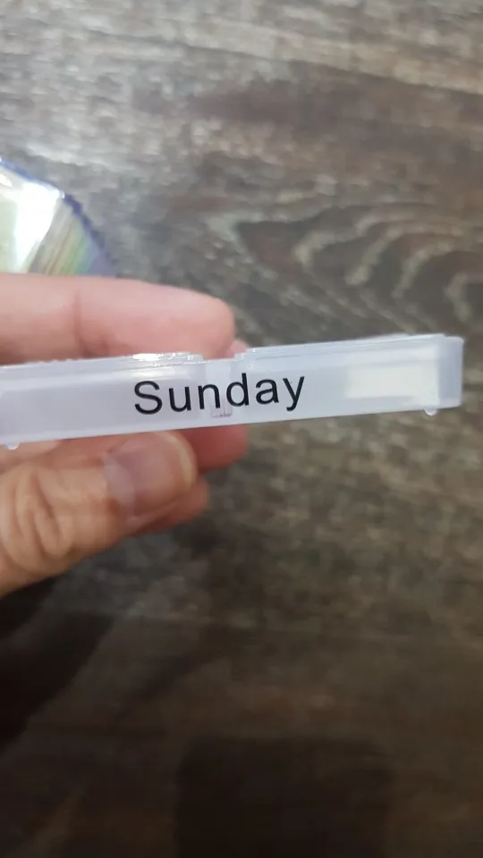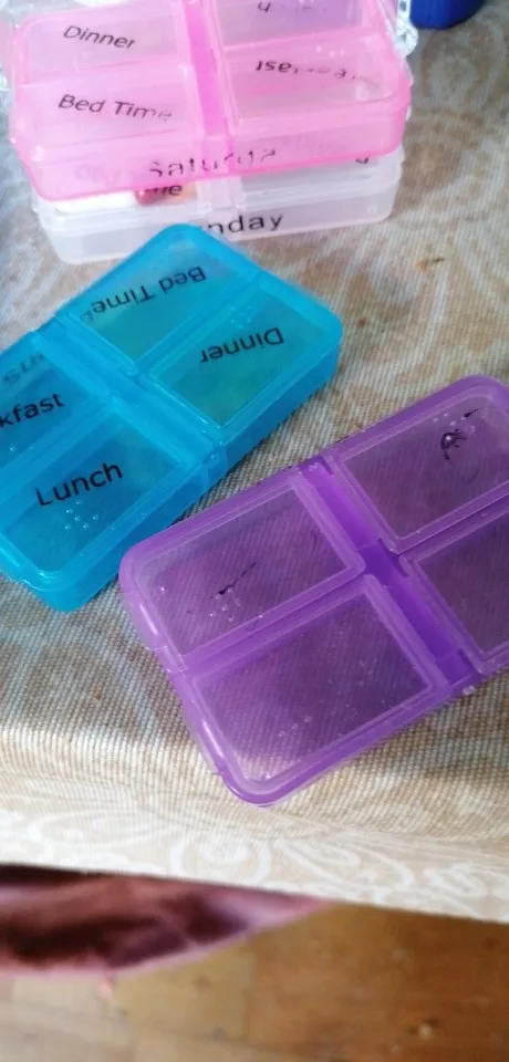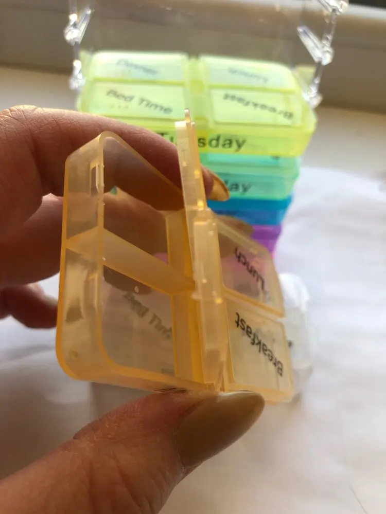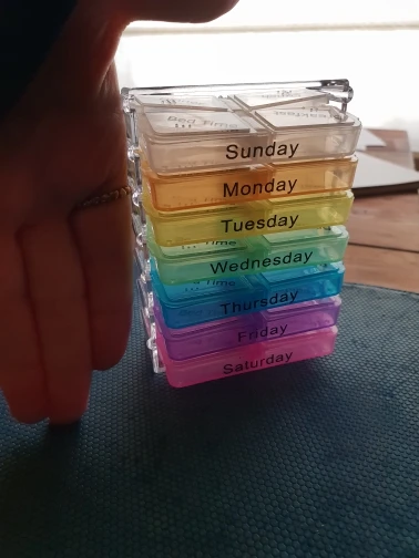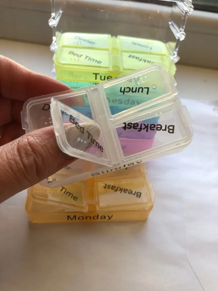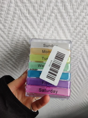 Кроме того, что это заняло много времени, чтобы открыть, тогда он не закрылся большими таблетками, и после того, как я пробовал маленькие таблетки, также не закрыл. Я разозлилась... я долго жду чехол для таблеток, который не работает. Фото на Aliexpress неточно. Настоящий криво, вы можете положить его таким образом, вы должны держать его плоским, чтобы увидеть изображение