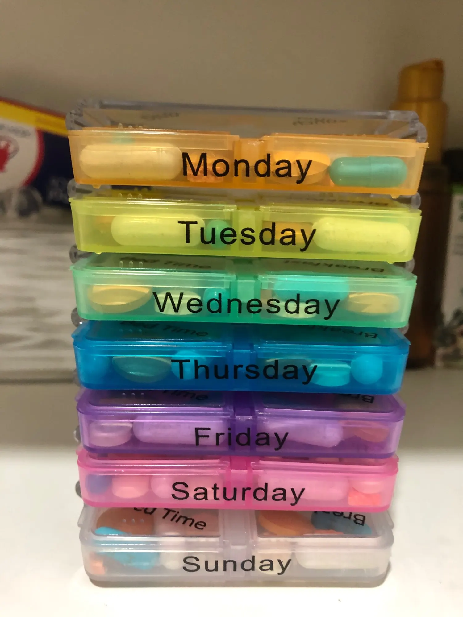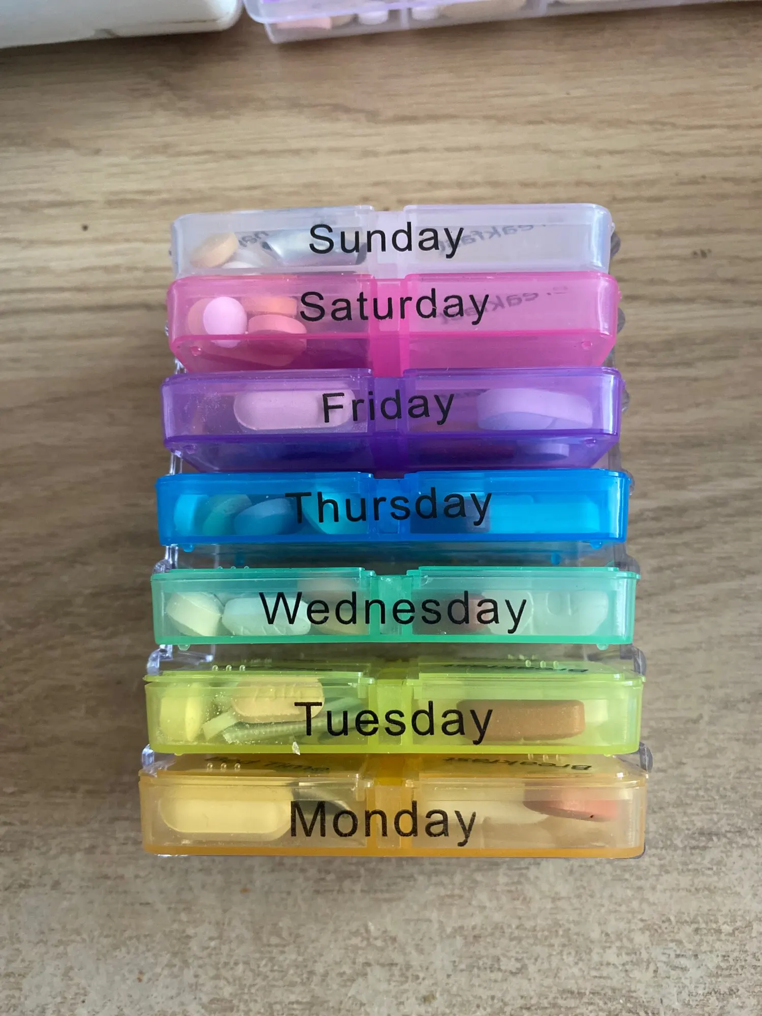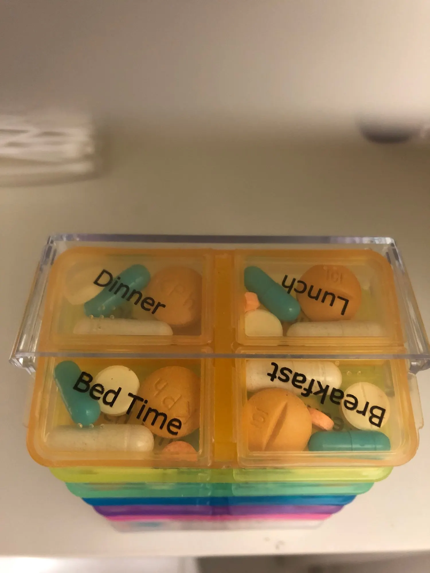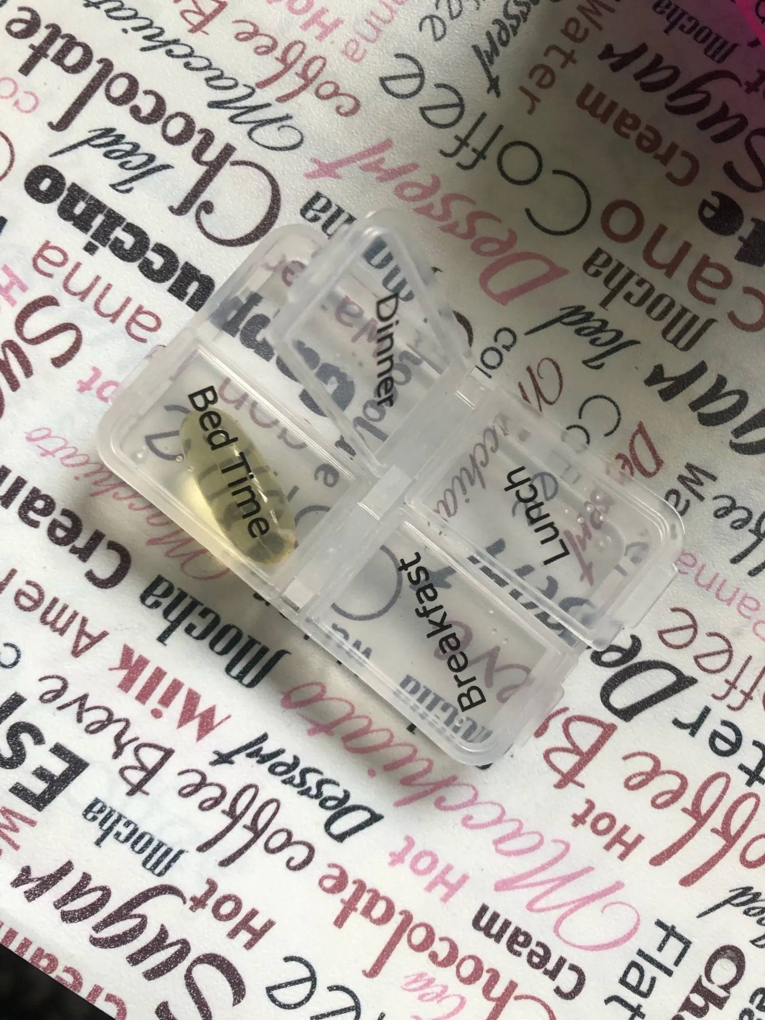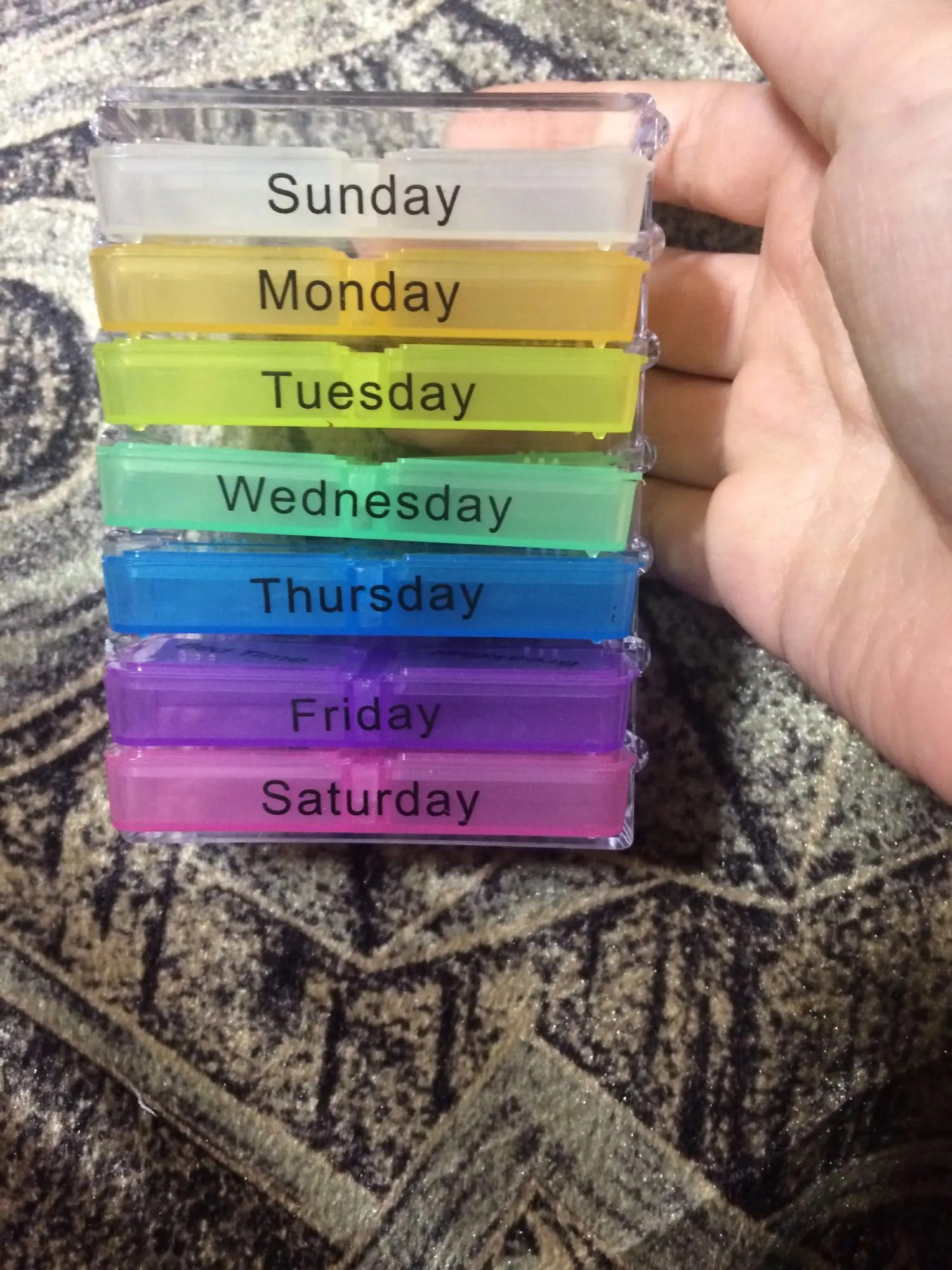 Кроме того, что это заняло много времени, чтобы открыть, тогда он не закрылся большими таблетками, и после того, как я пробовал маленькие таблетки, также не закрыл. Я разозлилась... я долго жду чехол для таблеток, который не работает. Фото на Aliexpress неточно. Настоящий криво, вы можете положить его таким образом, вы должны держать его плоским, чтобы увидеть изображение