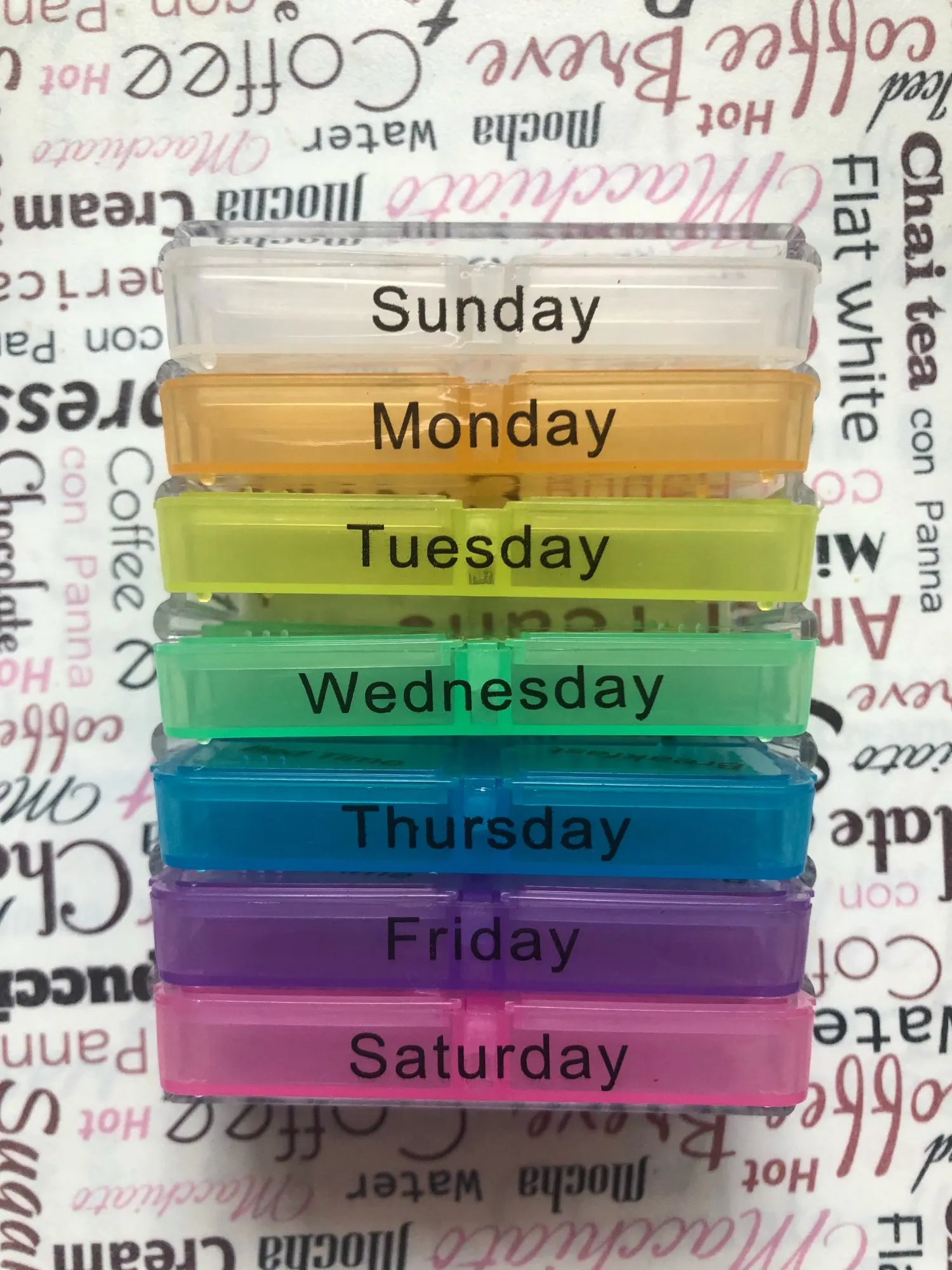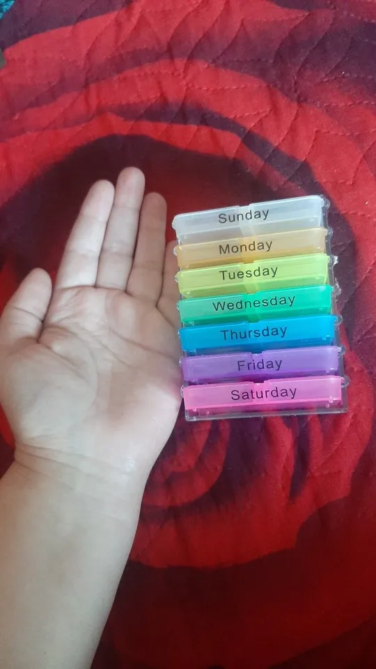 Он меньше, чем я ожидал, и слишком мал, чтобы держать мои ежедневные витамины и добавки. На рисунке он вертикальный, но Половина корпуса прилипает, поэтому вы должны положить его на его стороне, чтобы сделать его стабильным. Кроме того, надпись на корпусе не формована должным образом и не фиксируется должным образом. Это означает, что когда вы носите его, лекарство выходит из чехла.