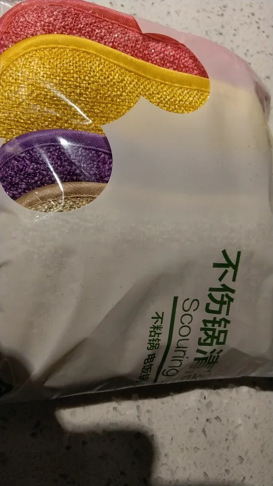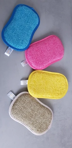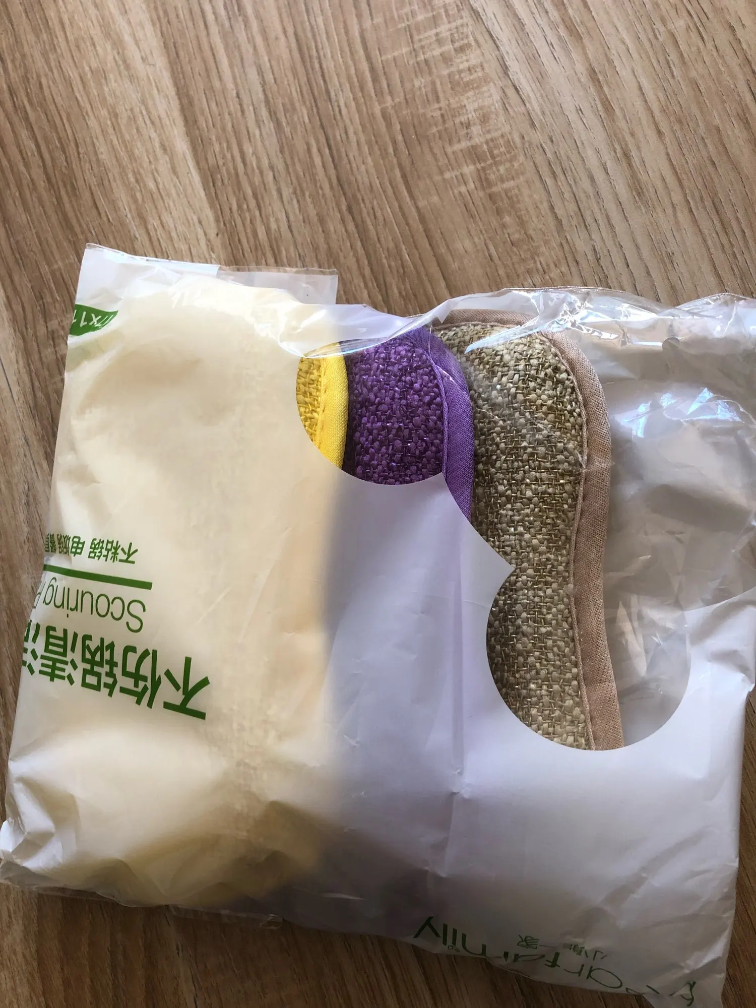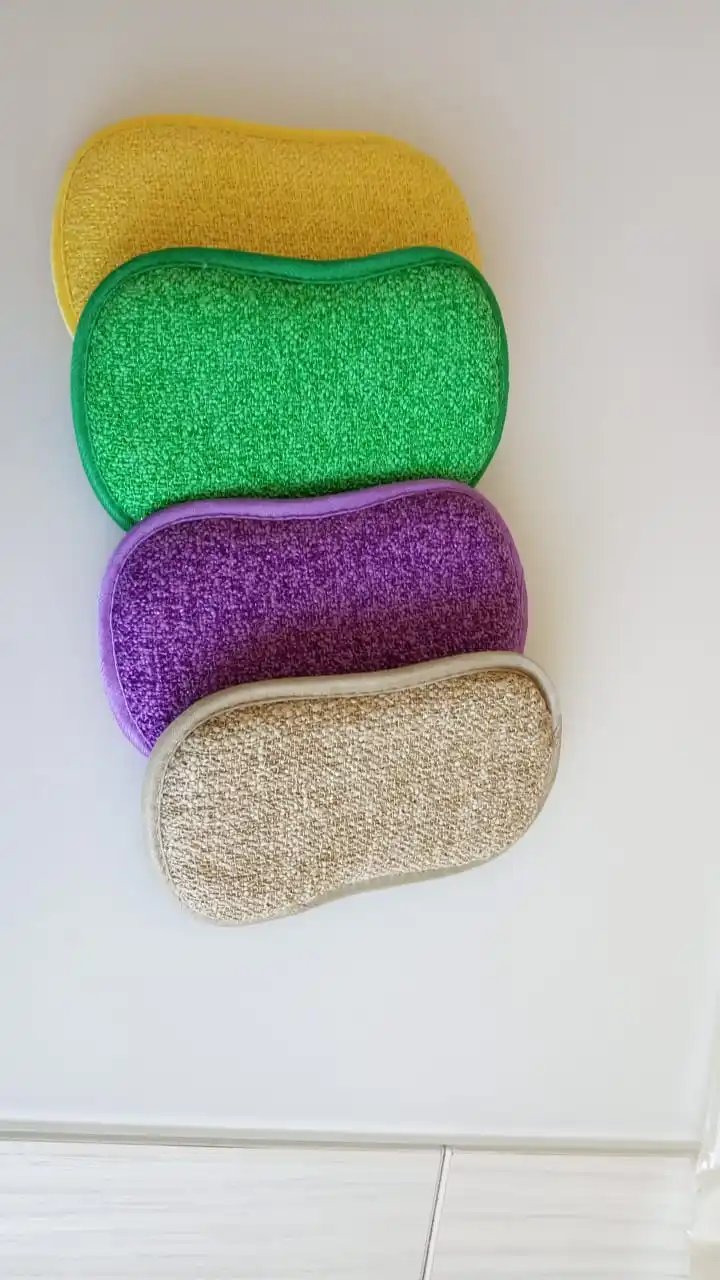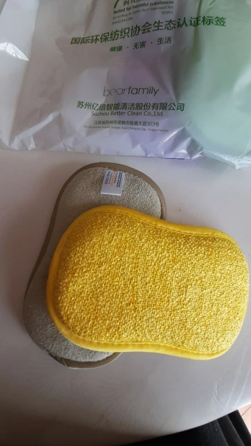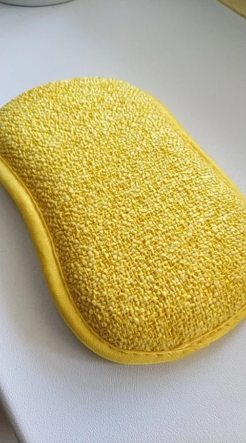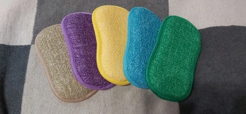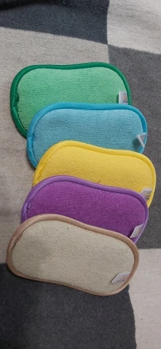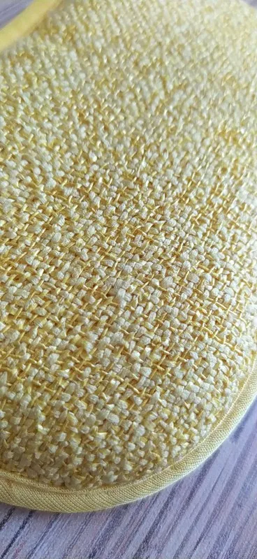 Одна сторона как будто полотенце,вторая -переплетение грубых волокон.Все как заявлено.Если бы был меньший размер,было бы удобнее мыть посуду.
