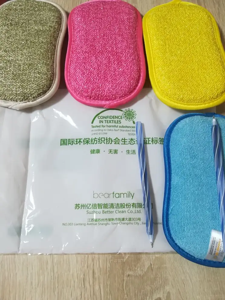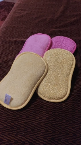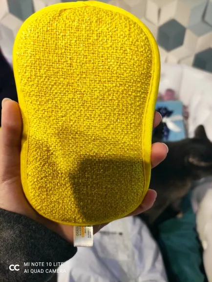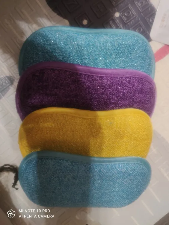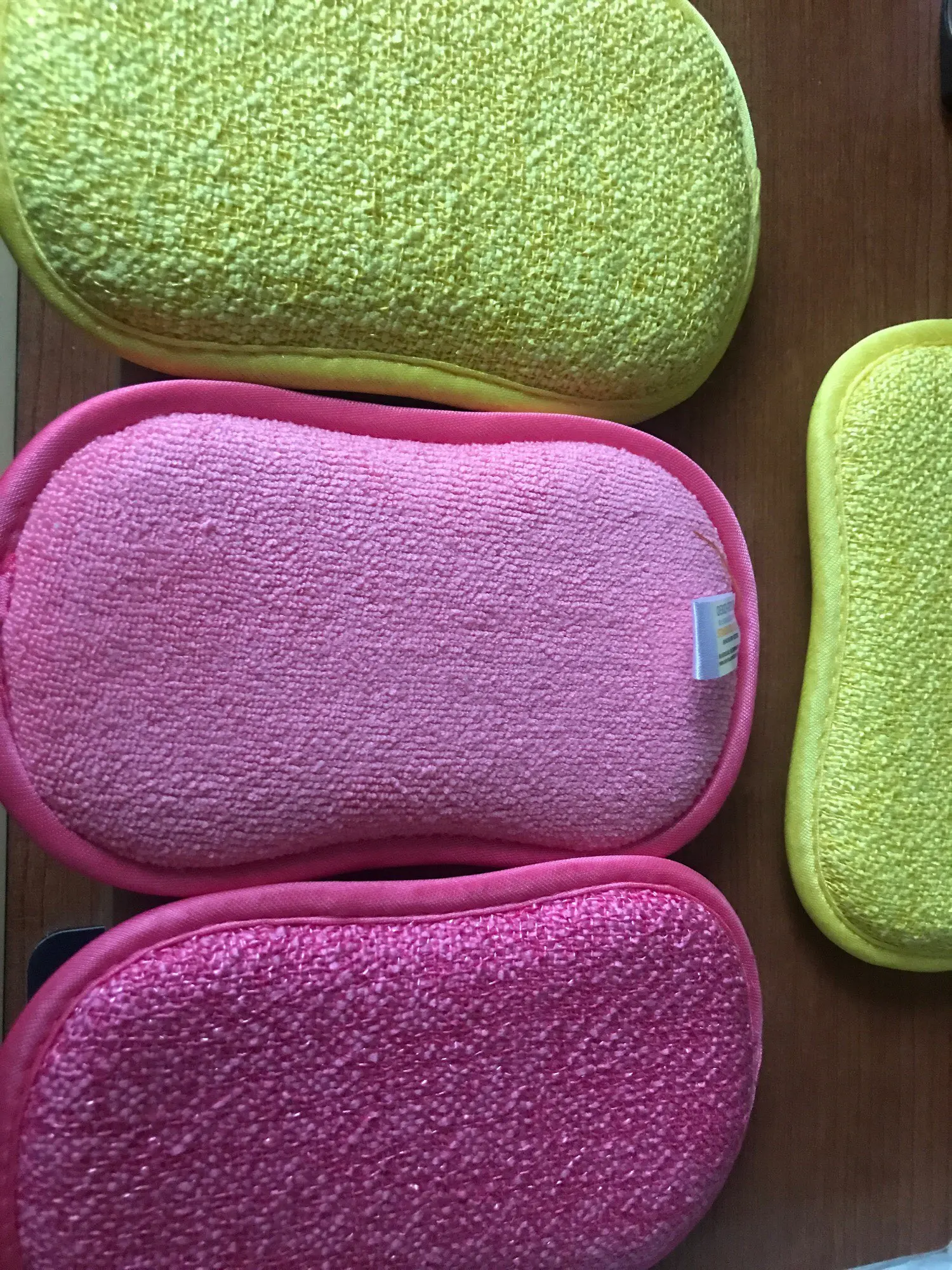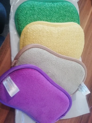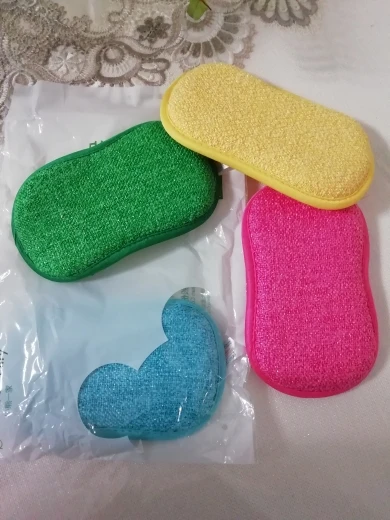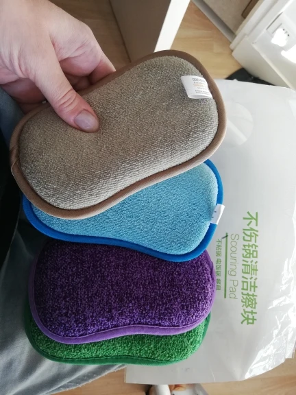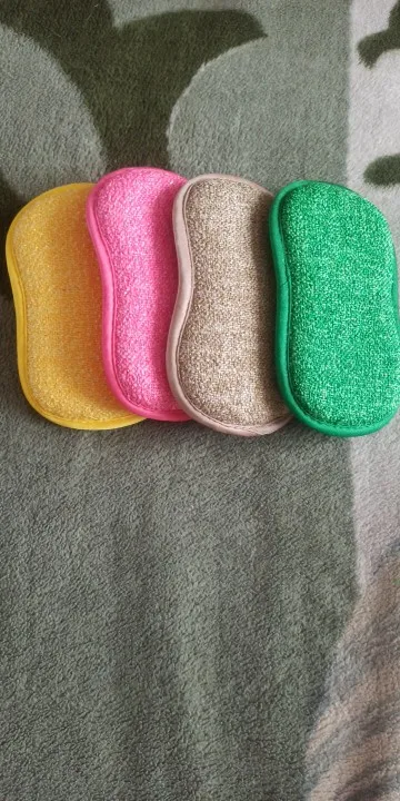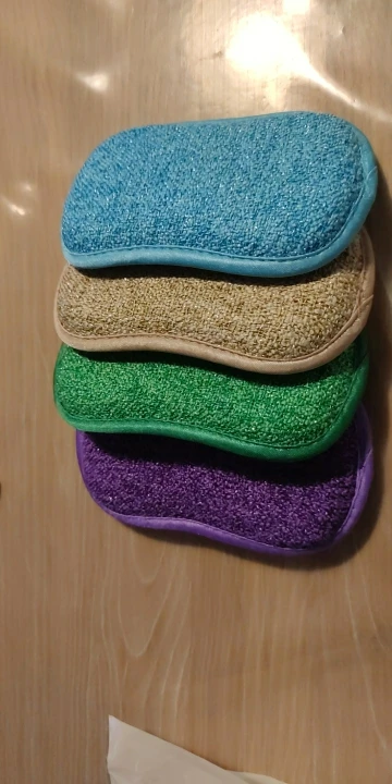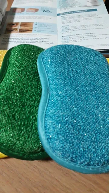 Быстрая доставка , соответствуют описанию, в деле пока ещё не особо попробовала , просто тарелки моет хорошо) но мне немного великовата в руке. Одна сторона мягкая, другая жёсткая, но не царапает руку