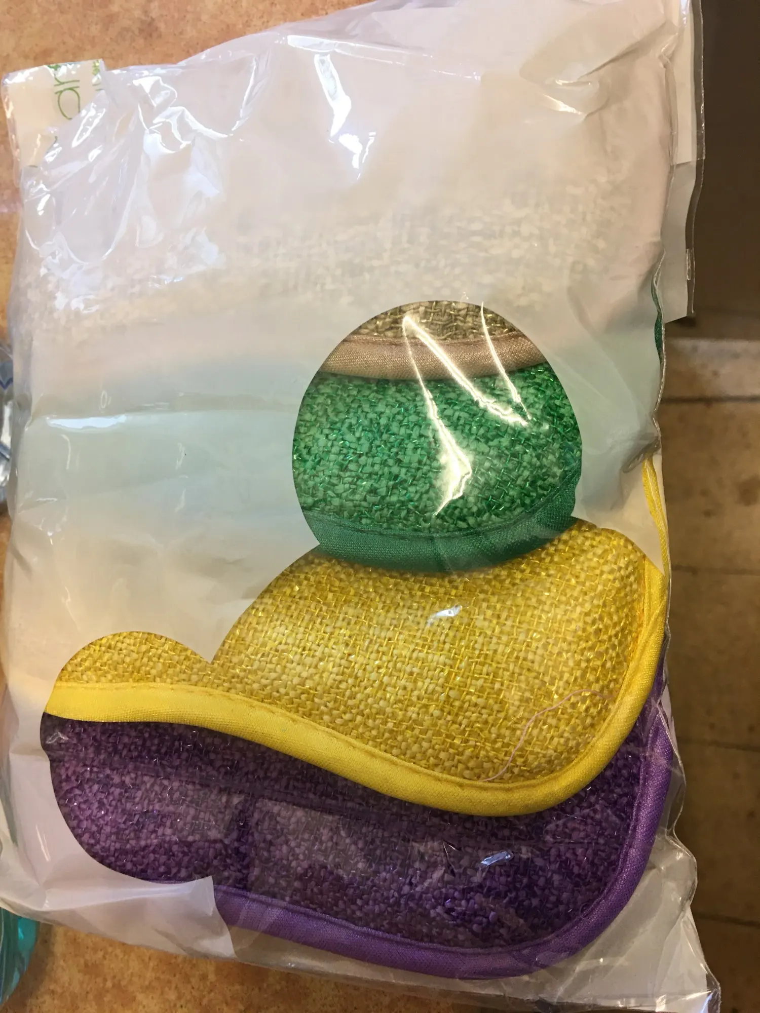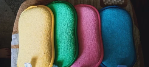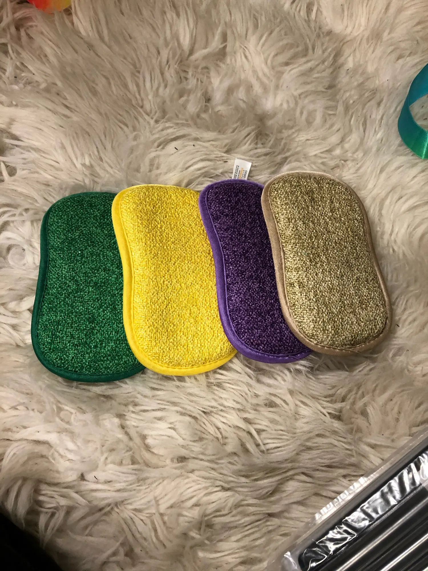 Четыре разноцветных ярких губки, удобные: с одной стороны мягкая ткань, с другой абразивная внутри наверное паролон. я довольна) с продавцом не общалась т.к. не бвло вопросов.
