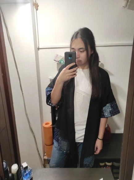 брал на размер больше, подошло всё как надо, немного просвечивает ткань, на ощупь ткань приятная, достаточно лёгкое хаори