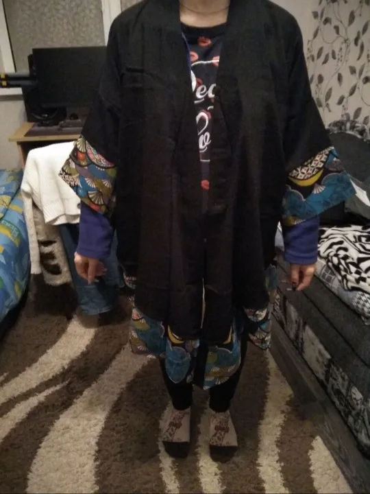 Нууу, такое себе, странное. Не сделали даже застежку\цепочку на груди, т.е. распахивается постоянно. С размером не угадал - чутка оверсайз, хотя по стилю может быть и не заметно. Ткань таки тонкая, просвечивает. Натуральная ткань или нет - без понятия. Я бы сказал, что цена за такое изделие завышена. Но т.к. (на удивление) альтернатив не так много, то - штош. Тем более, оно мне понравилось, за это и 5 звезд можно.