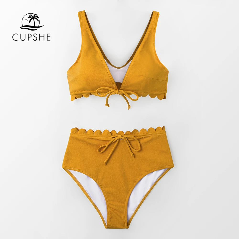 CUPSHE, сексуальные, желтые, с завязками спереди, волнистые бикини, наборы для женщин, высокая талия, однотонные, два предмета, купальники, 2021, для девушек, пляжные купальные костюмы