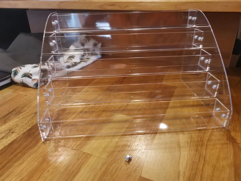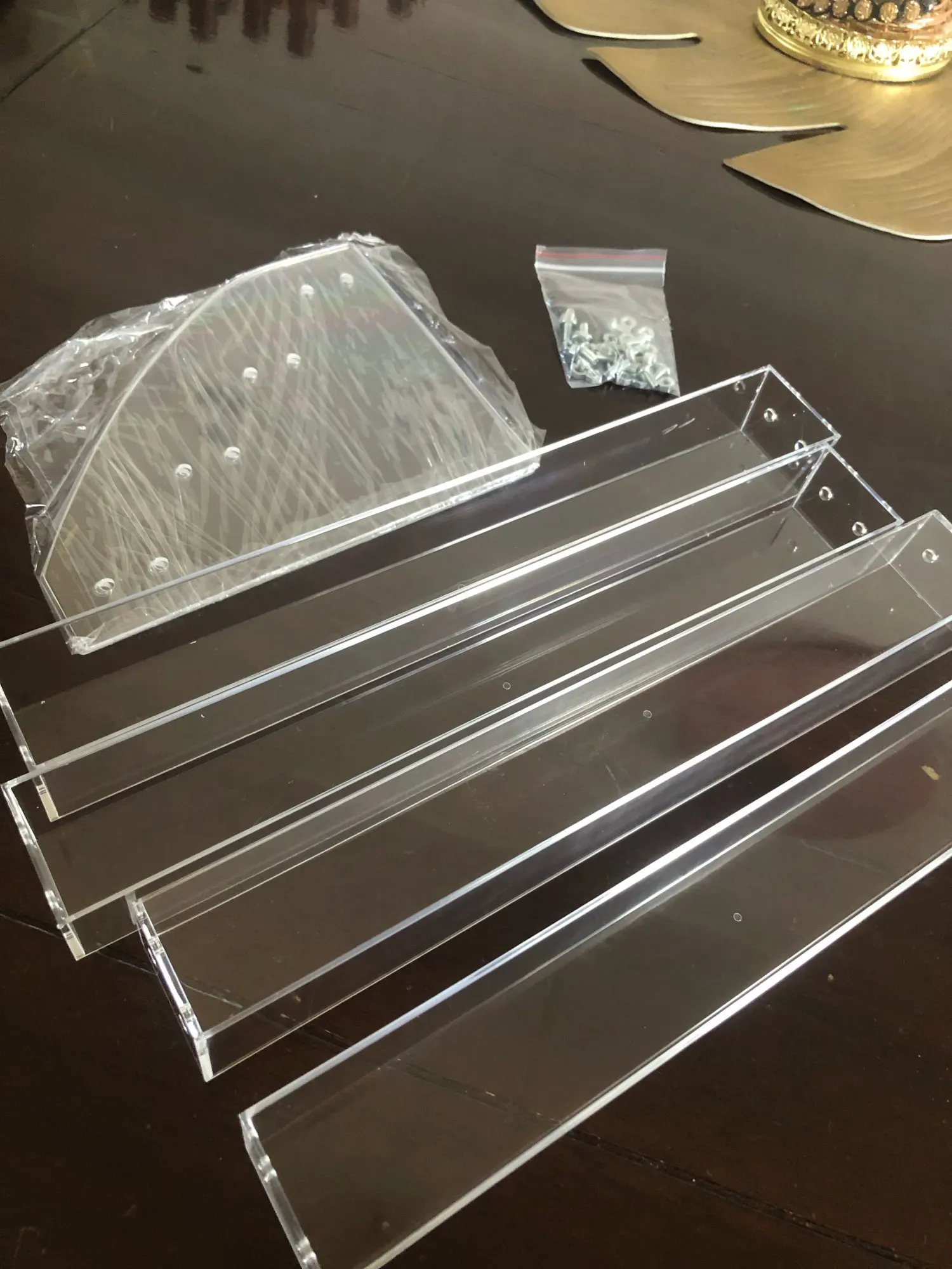 Посылка дошла до Москвы примерно за месяц, в целом было неплохо все упаковано, но одна из полок все-таки с трещиной, скорее всего при транспортировке прижали чем-то тяжелым. Собирается легко, в комплекте идут винтики и гайки. В целом покупкой довольна, но цена на мой взгляд высоковата для такой пластиковой полочки на винтиках.