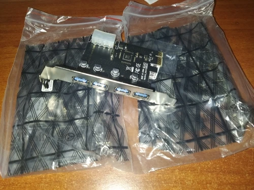 пришло в пакете, плата и винтик! Без доп питания не работает. в 10ю винду дрова не нужны.