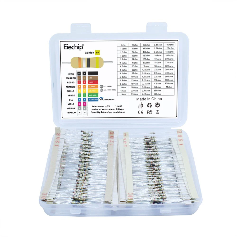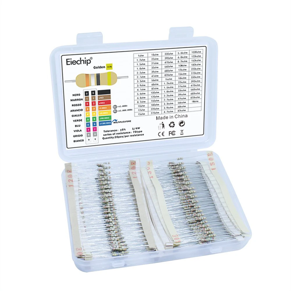 Набор электрорезисторов 1500 шт.лот, 5% мощных углеродных пленочных резисторов, 75 значений, 1 Ом-10 м ом, сопротивление, набор электронных резисторов