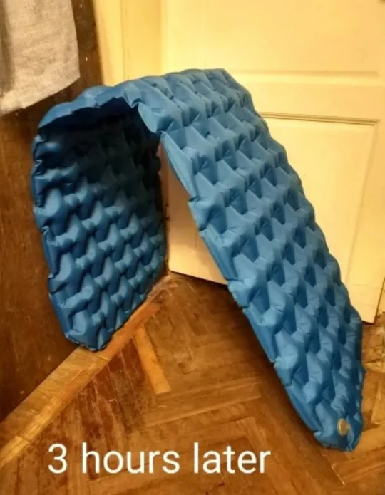 Общее впечатление положительное. За 2 недели в надутом до упора состоянии спустили незначительно. Спали для теста дома на полу, поэтому, про теплоихоляционные характеристики нечего сказать. Спать комфортно, даже лёжа на боку не проседает до пола, но, всё же, эффективная толщина слоя под телом уменьшается существенно. Рисунок неоднозначный, из опыта скажу, что есть более удачные варианты, но уже не на Али. все недостатки компенсируются частично ценой, частично весом. Но это не бескомпромиссный вариант.