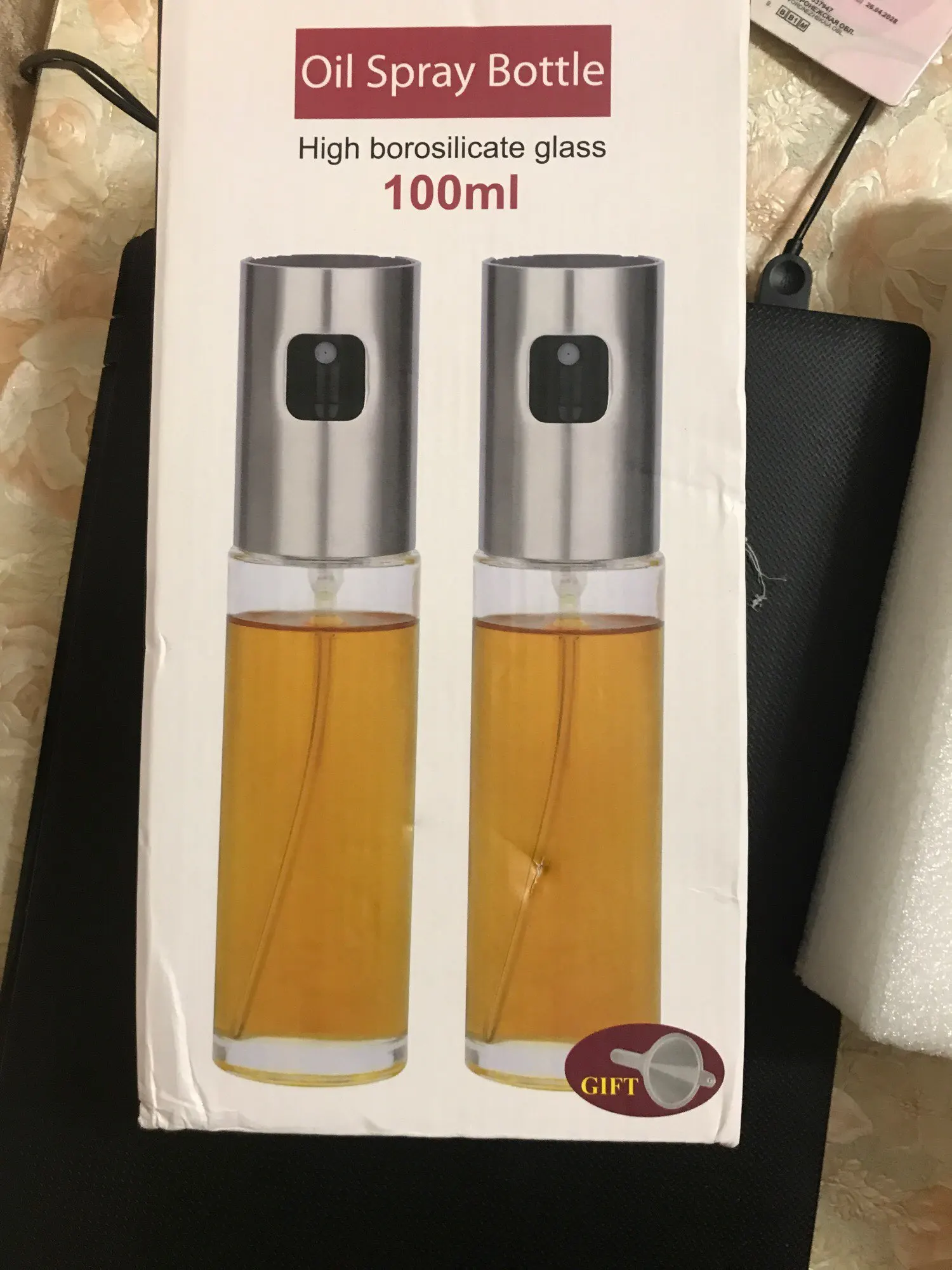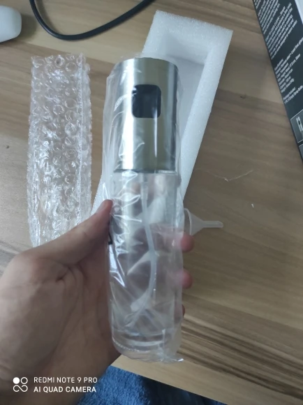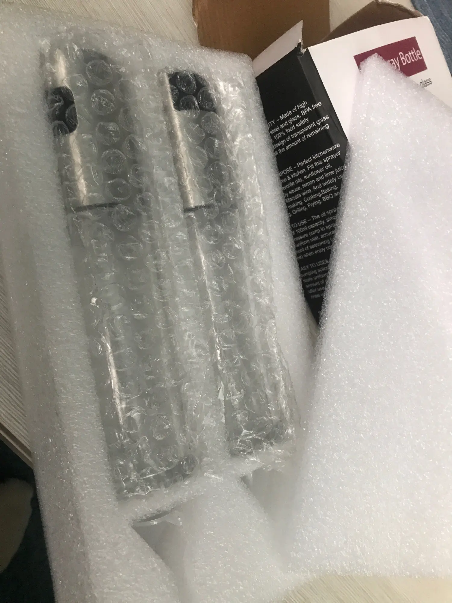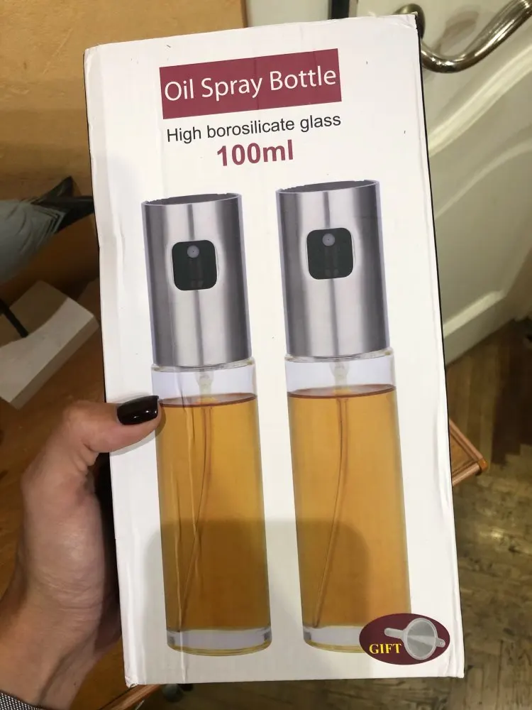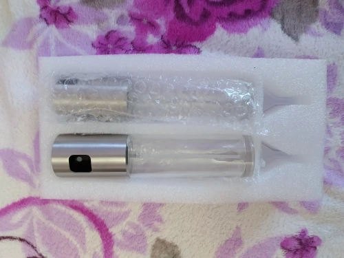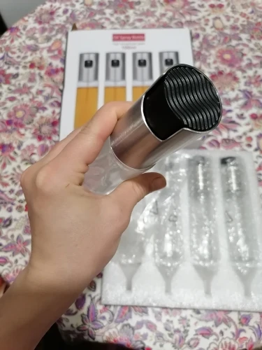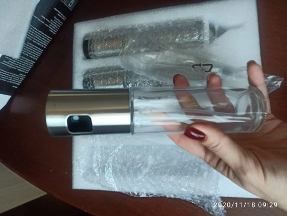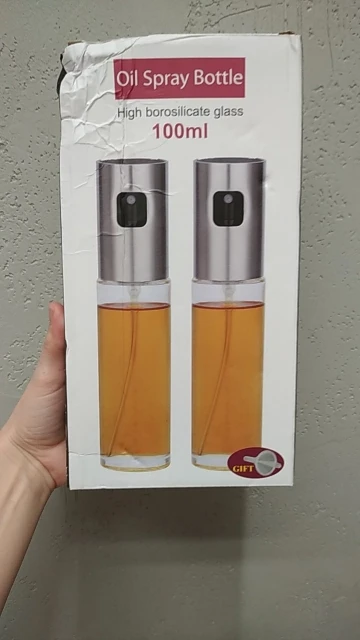 Привезли курьером в мск за 2 дня!!! Упаковка на миллион. В комплекте были воронки , очень удобно. Стеклянные колбы, механизм работает. Приложила фото как распыливает масло. В принципе, хорошо, на вид брызгает мало - но ооочень мелко дисперсное, и по идее нормально получается по объёму. В общем, штука огонь, давно мечтала, рада, что купила не готовую штучку, а пустую- она стильно выглядит на кухне