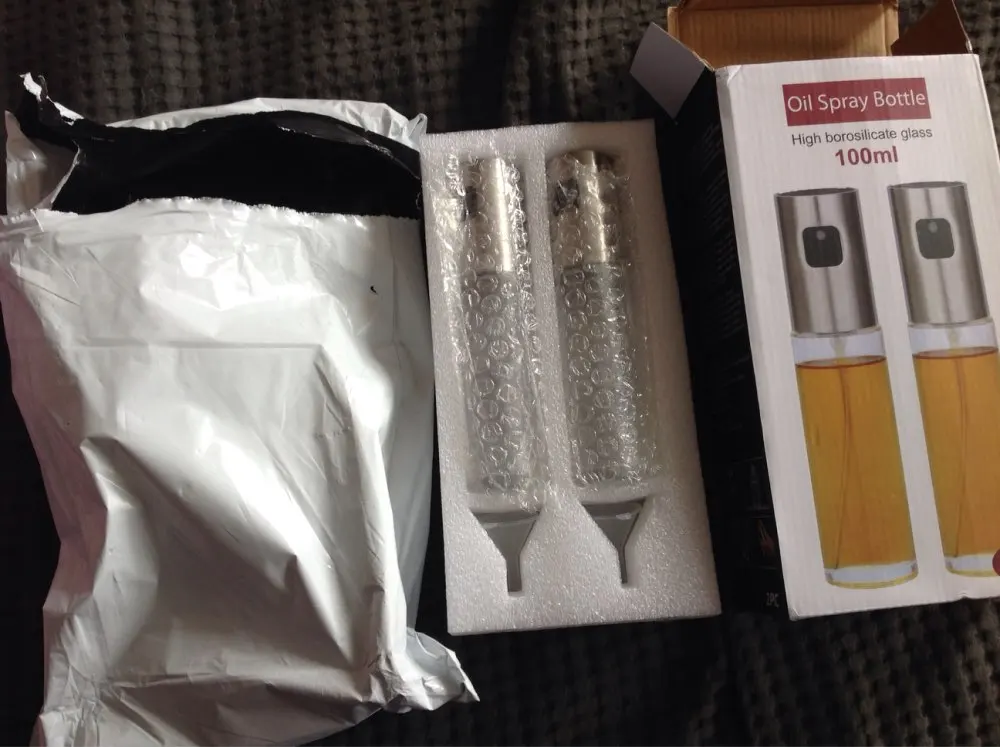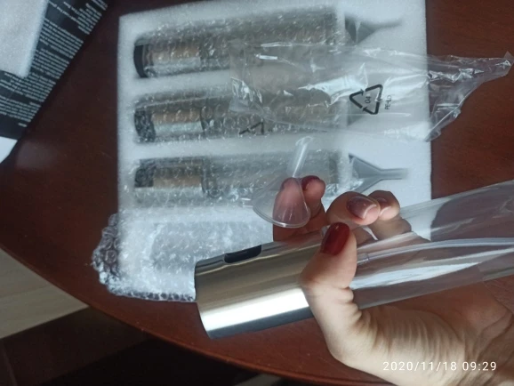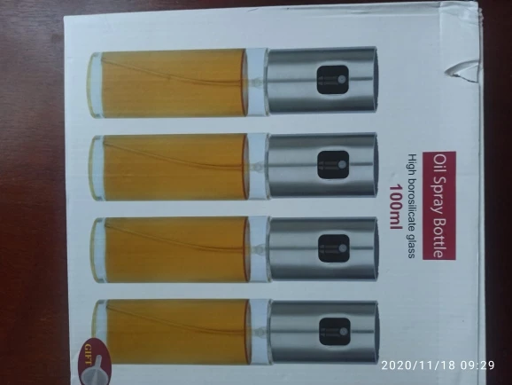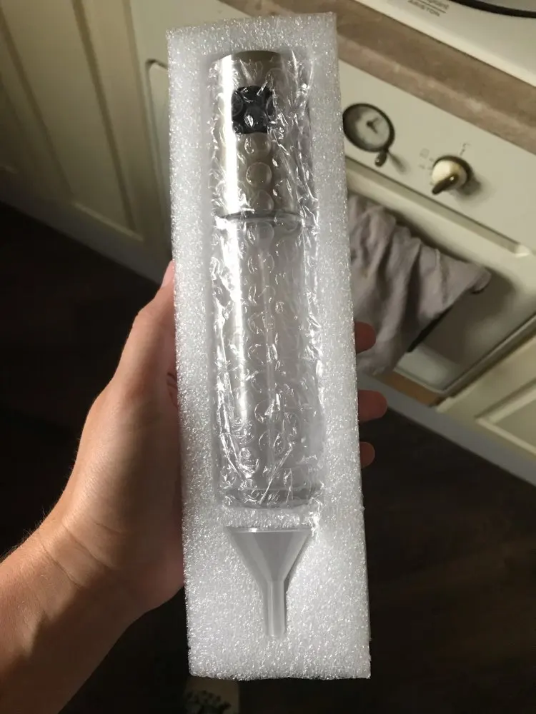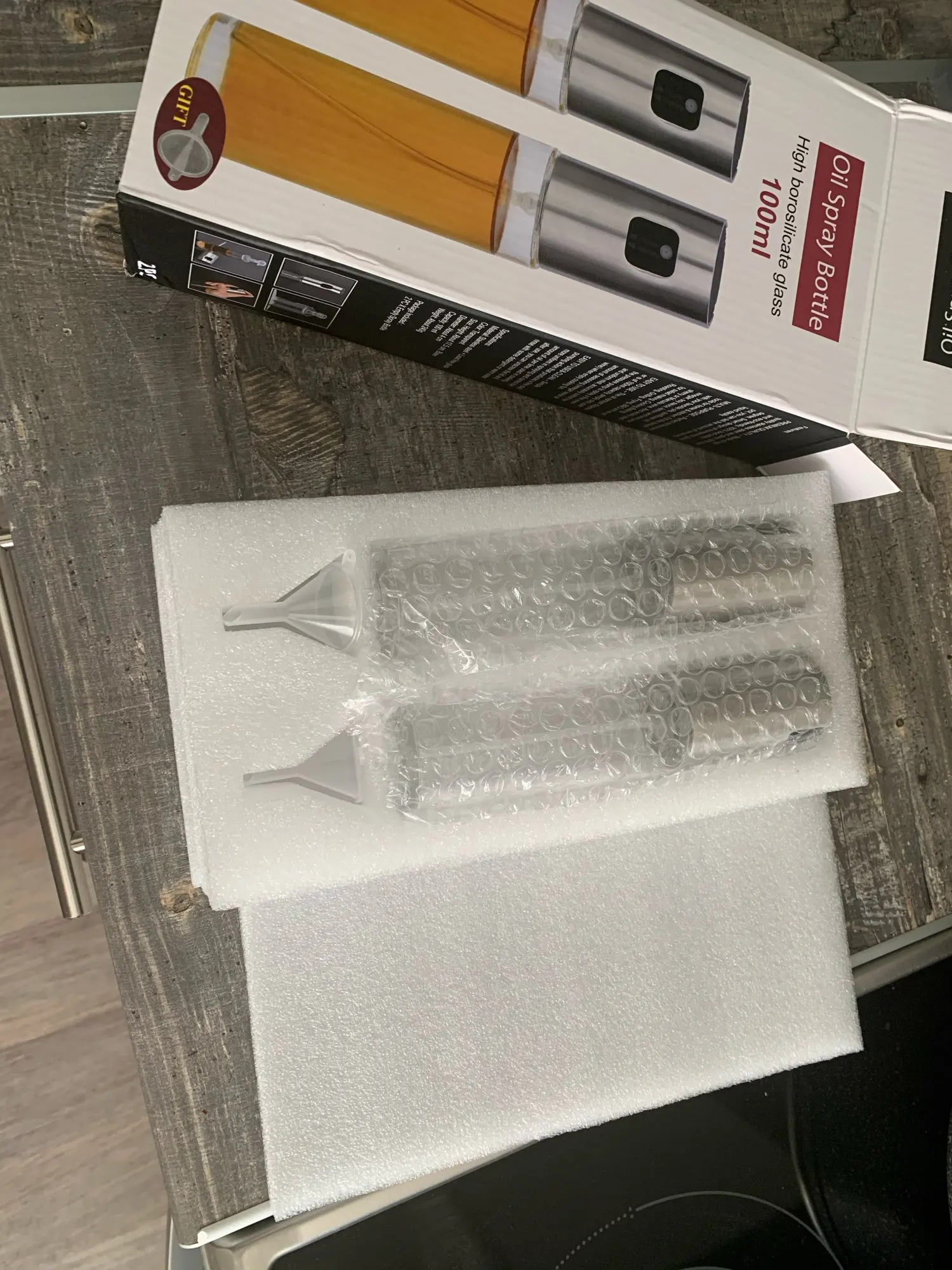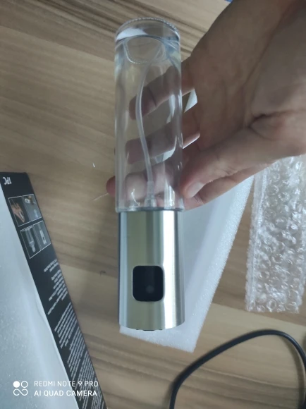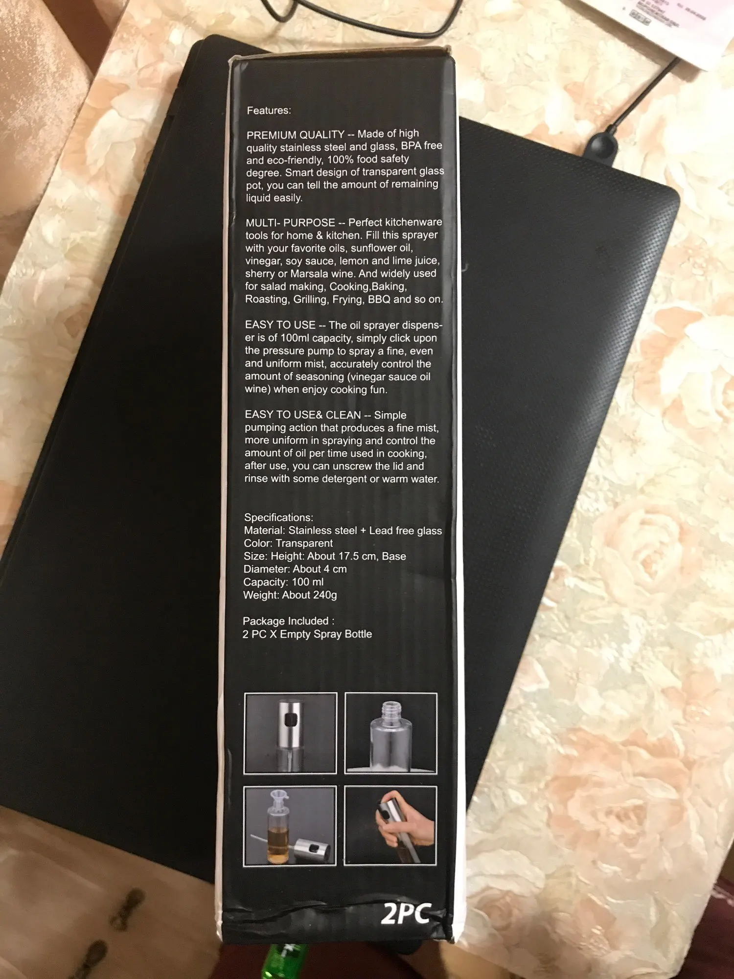 Привезли курьером в мск за 2 дня!!! Упаковка на миллион. В комплекте были воронки , очень удобно. Стеклянные колбы, механизм работает. Приложила фото как распыливает масло. В принципе, хорошо, на вид брызгает мало - но ооочень мелко дисперсное, и по идее нормально получается по объёму. В общем, штука огонь, давно мечтала, рада, что купила не готовую штучку, а пустую- она стильно выглядит на кухне