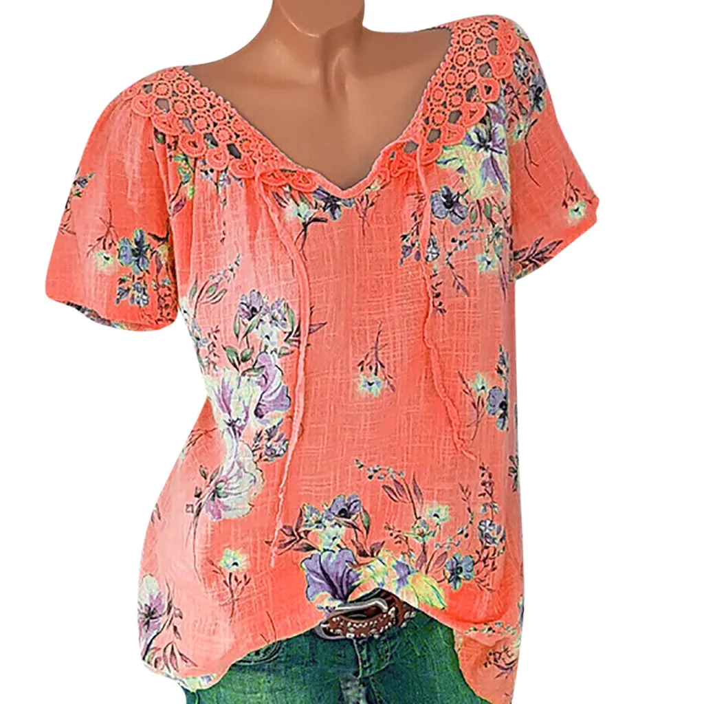 Женская Кружевная блуза с v-образным вырезом и коротким рукавом большого размера