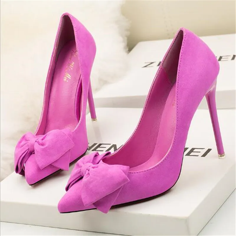Корейская версия 2021 г., новые модные милые замшевые женские туфли на очень высоком каблуке с закрытым острым носком и бантом свадебные туфли