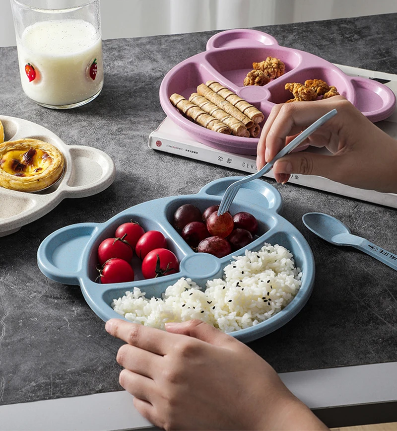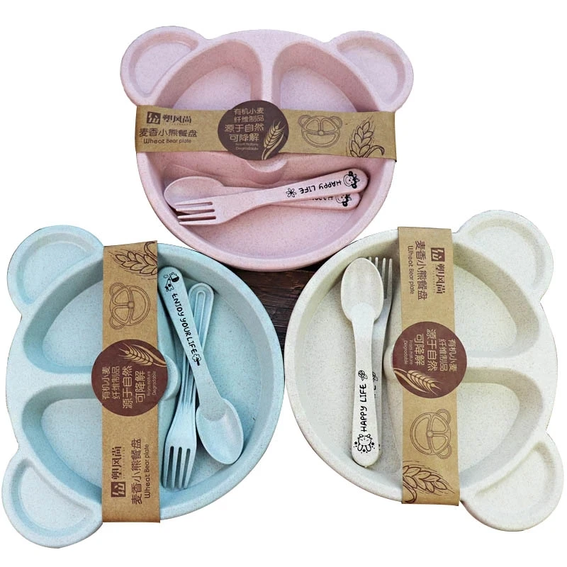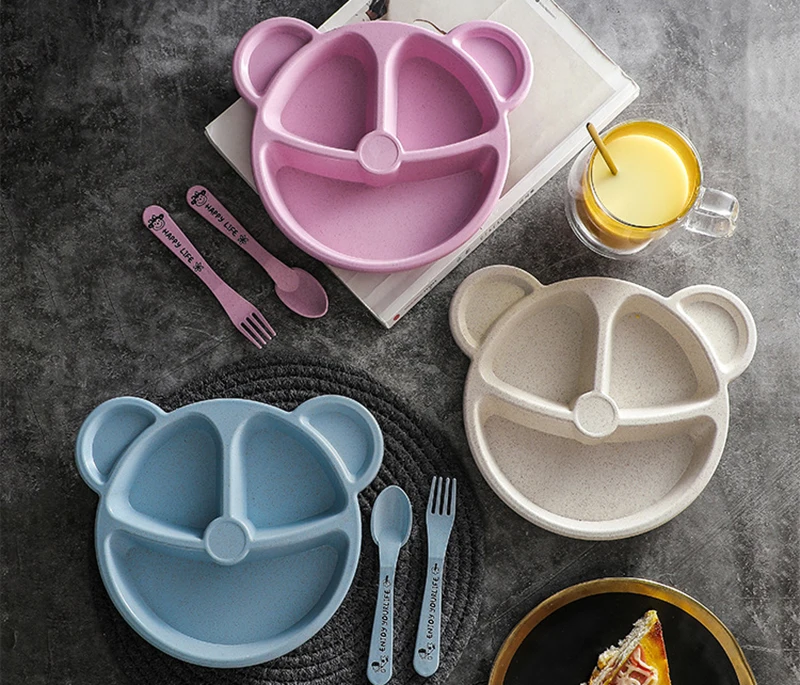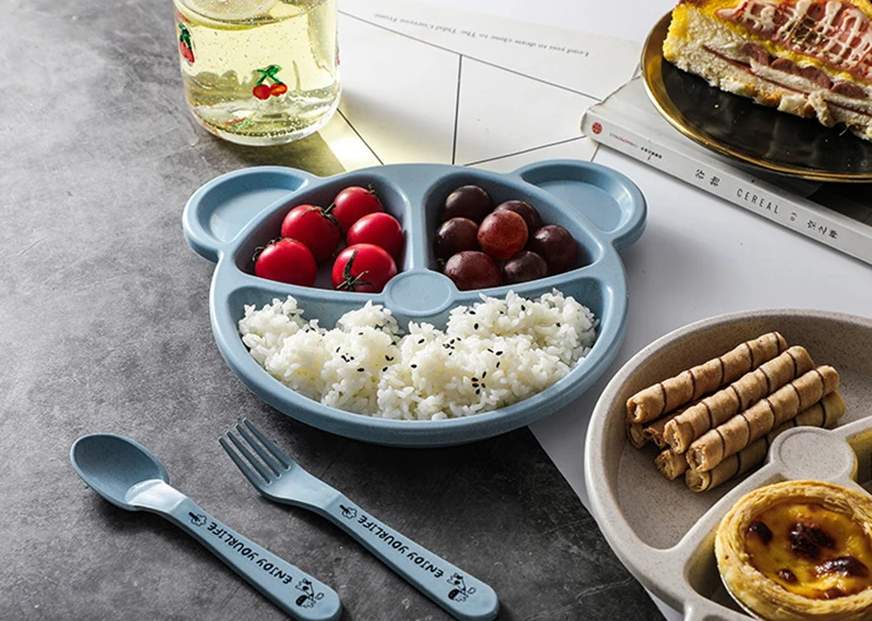 Набор детской посуды: миска, ложка, вилка, мультяшный медведь, детская посуда для еды, тренировочная тарелка из пшеничной соломы
