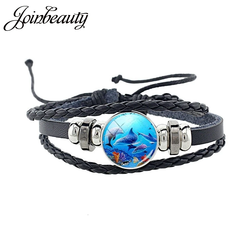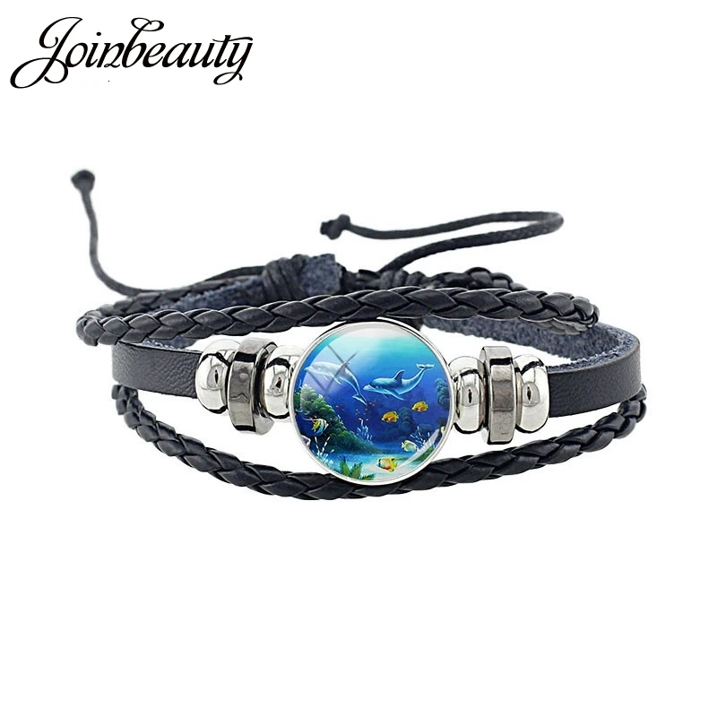 JOINBEAUTY кожаный браслет в стиле панк милое изображение дельфина черный плетеный кожаный браслет стеклянные купольные украшения браслет ZZ132