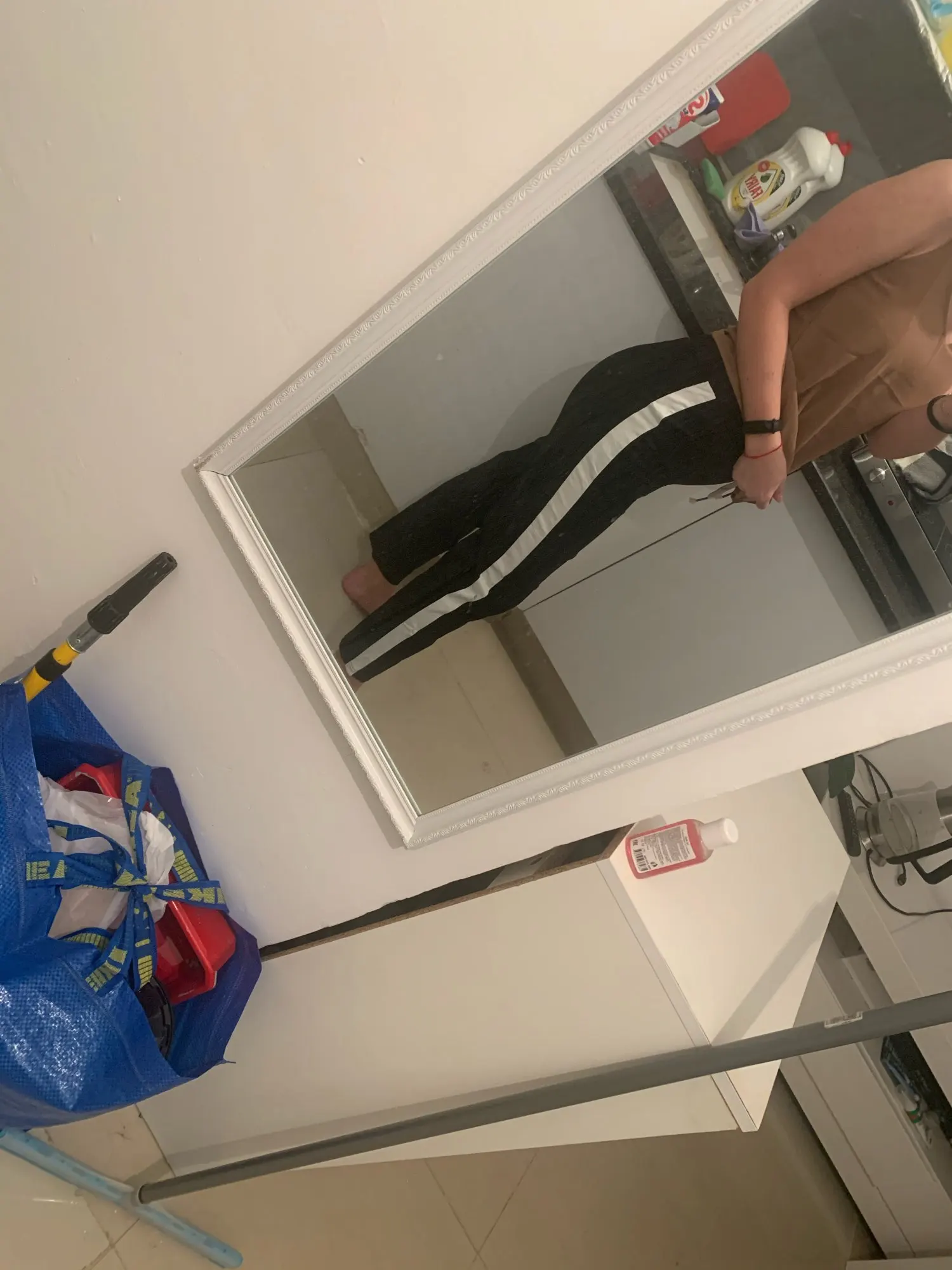 Не разглядела цвет по фото. Цвет беж с белой полосой. Думала будут светлее. Материал попахивает каким то дихлофосом но я ещё не стирала. Но ,в целом ,не плохие. На 47 кг рост 160 размер хл подошёл. Сидят как на картинке . Доставка быстрая