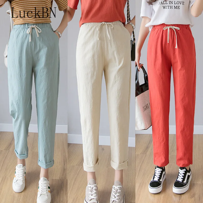 Женские длинные брюки до щиколотки Harajuku, повседневные однотонные брюки из хлопка и льна с эластичной талией, черные, лето-осень 2021