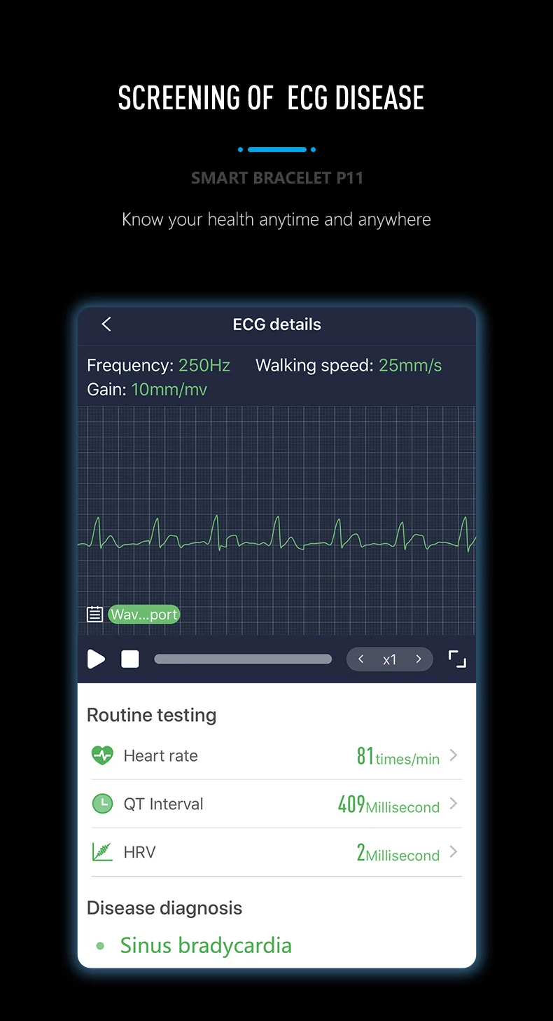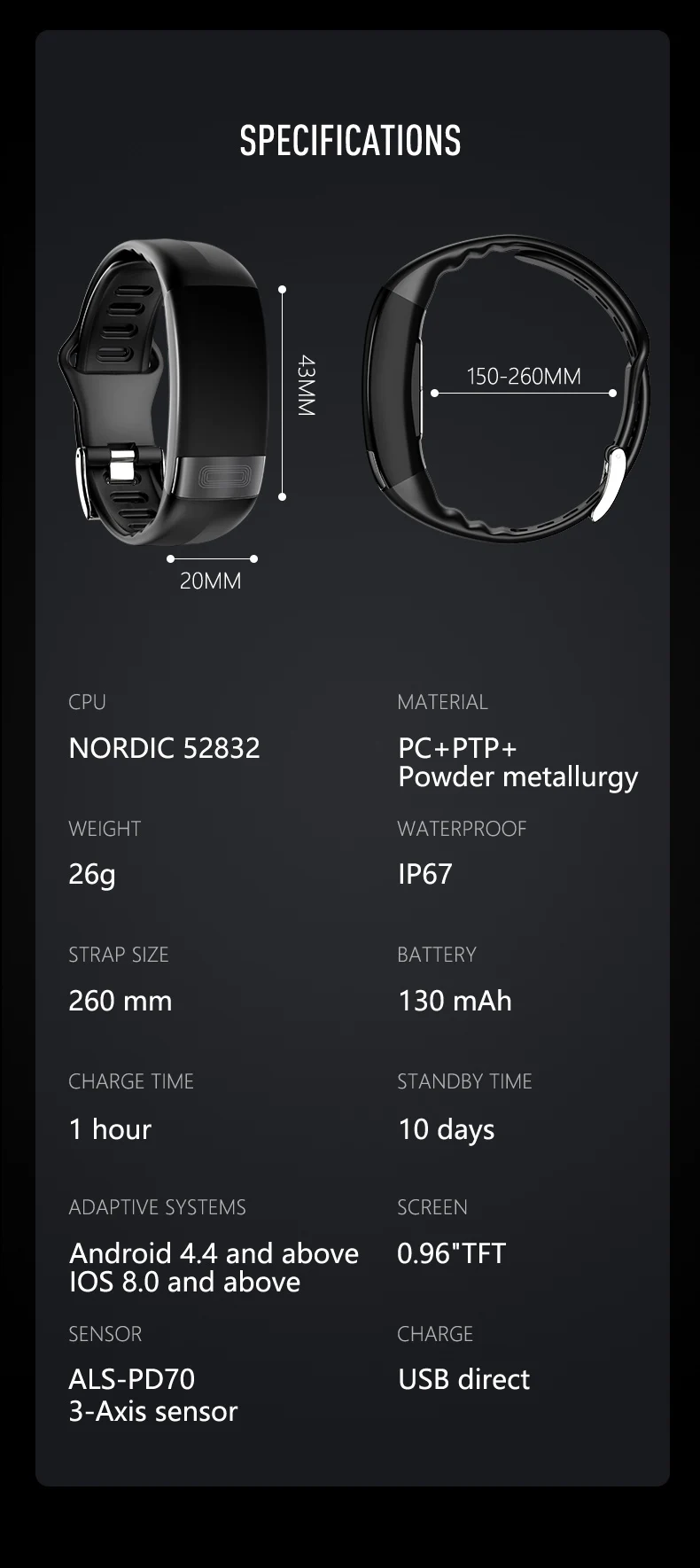 Модель: умные часы-браслет JingTider P11Чип: скандинавский 52832Дисплей: цветной экран, 0,96 дюймаАккумулятор: 130 мАчУровень водонепроницаемости: IP67Время работы в режиме ожидания: 10 днейПоддержка системы Мобильный телефон: IOS 8,0 и выше, Android 4,4 и вышеФункция мониторинга сердечного ритма: ПоддержкаФункция контроля артериального давления: ПоддержкаКонтроль ЭКГ: ПоддержкаПринцип мониторинга: сверхпроводящий электрод порошковой металлургии ЭКГBluetooth: 4,0Зарядка: зарядка через USB