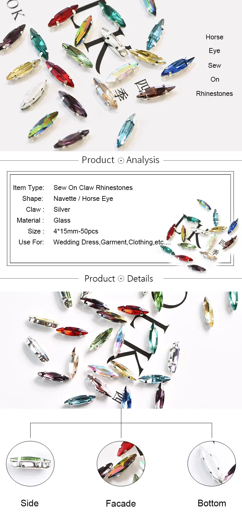 50 шт., 4x15 мм, Длинные цветные стеклянные стразы конский глаз, стразы для пришивания, стразы с листьями, свадебное платье B3758